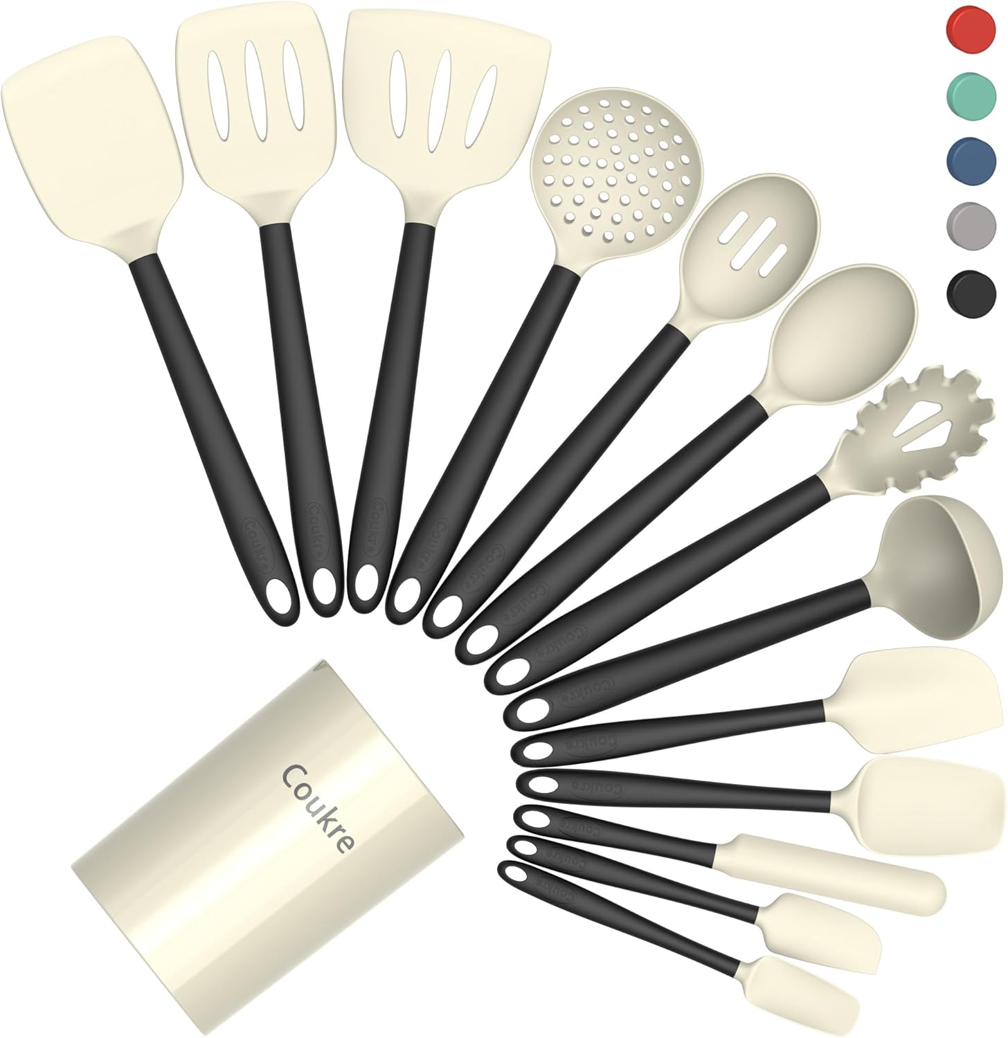 Coukre Silicone Kitchen Cooking Utensils Set with Holder – Heat-Resistant, Food-Grade Kitchen Tools, Spatula, Spoon & Gadgets for Non-Stick Pans, Dishwasher Safe (14, Beige)
