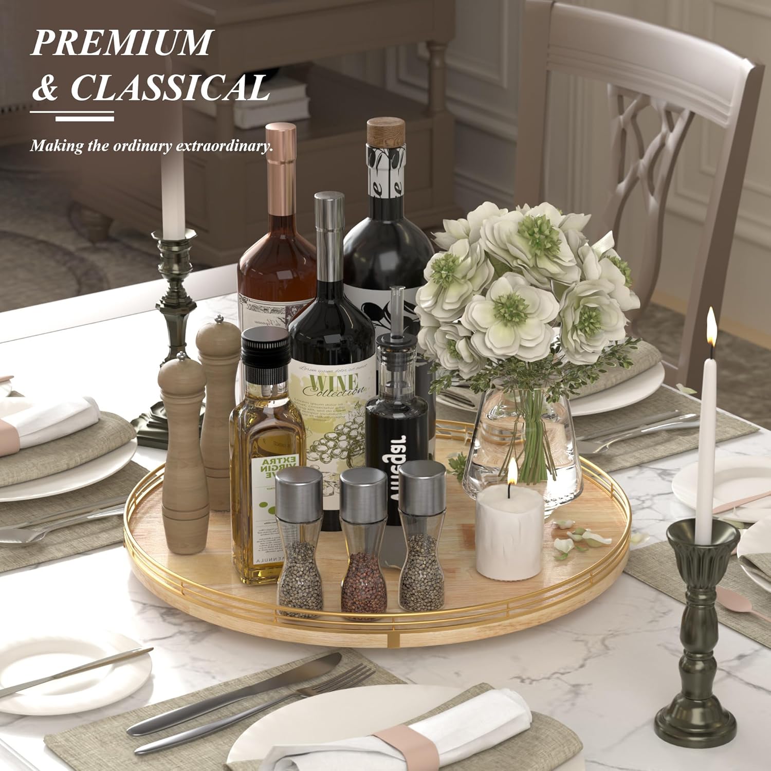 - Extra-Large 18” Surface – Perfect size for family-style dining, buffet spreads, charcuterie boards, condiments, or tabletop organization in kitchens, dining rooms, or coffee tables.