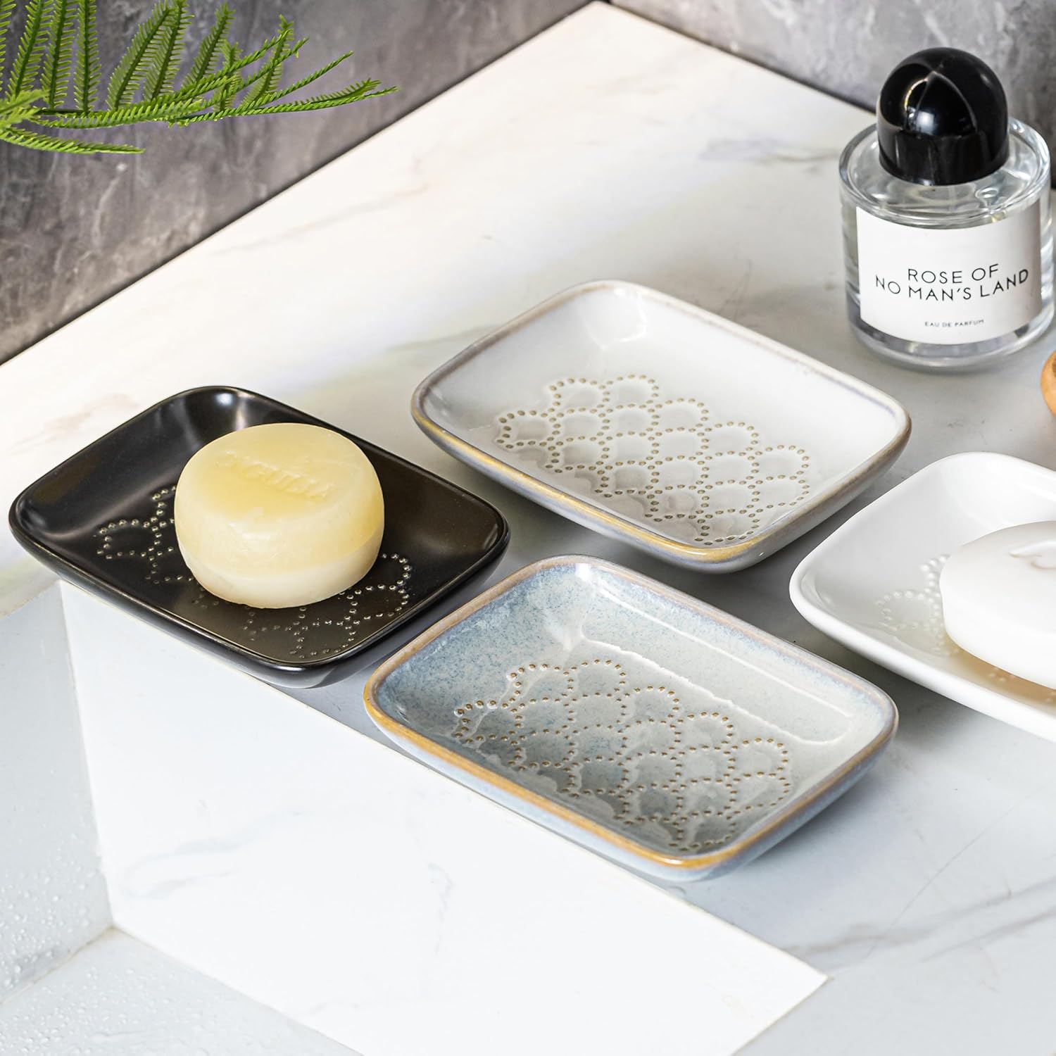 - PREMIUM CERAMIC SOAP DISH: Crafted from premium and enduring ceramic, this soap tray features waterproof, slip-resistant, and heat-resistant properties. Its unglazed bottom ensures the stability of the soap dish and prevents the dish from accidentally slipping into the sink, making it ideal for use on bathroom and kitchen countertops.