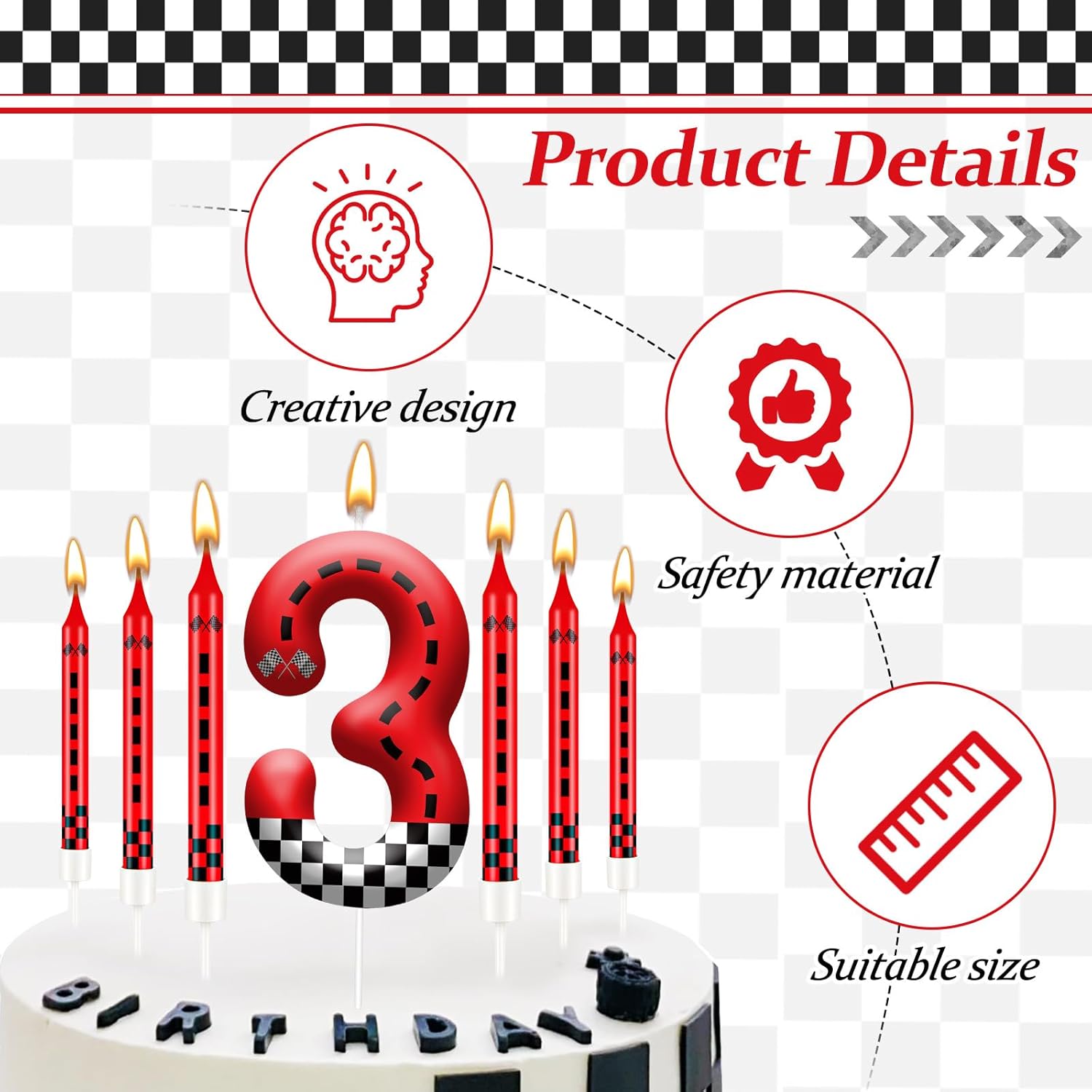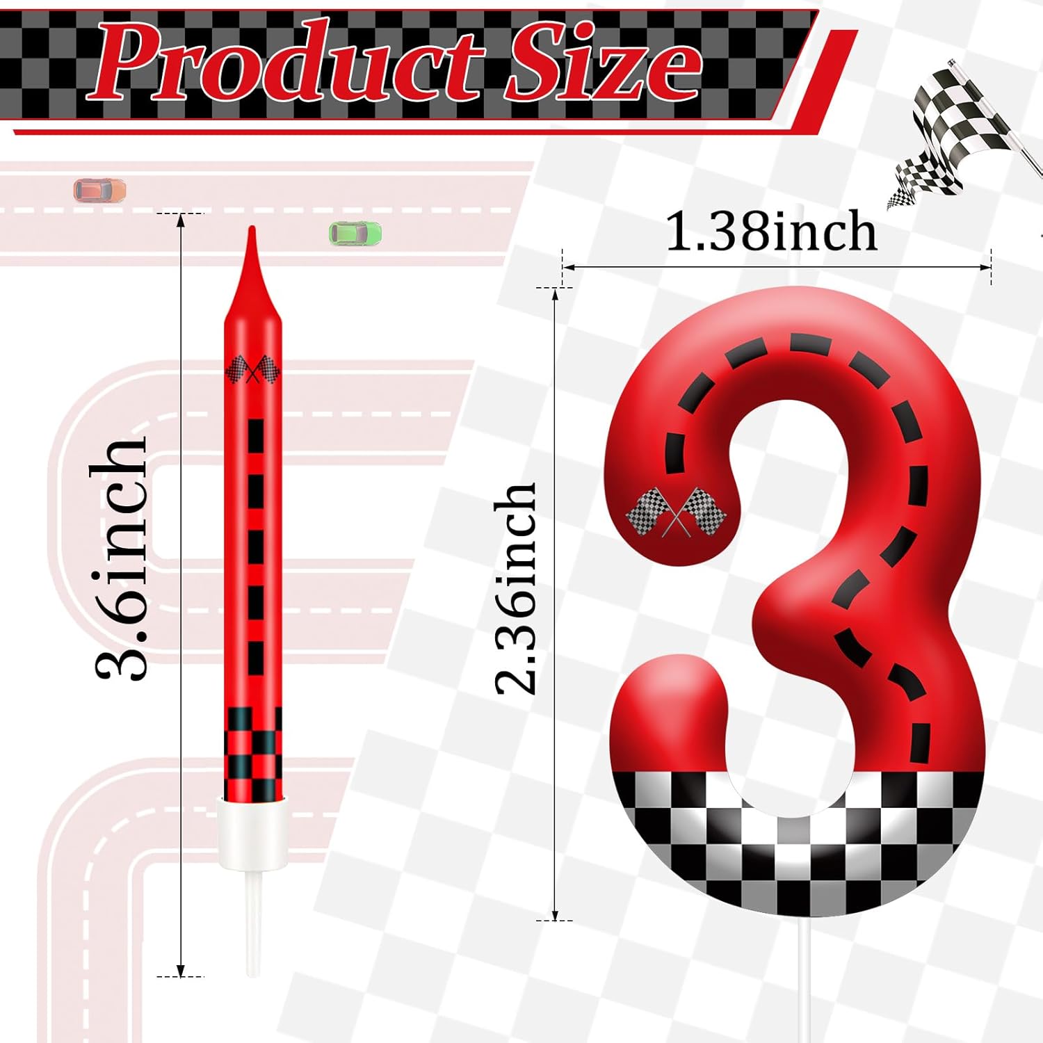 13PCS Racing Car Theme Birthday Candle Set with Checkered Flag Design - Durable Cake Topper for Race Car Party Decorations, Kids Birthday Supplies - Number 3 Candle for Racing-Themed Celebrations