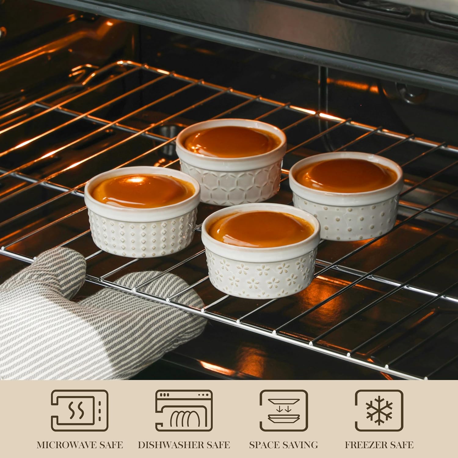 - 【Premium Ceramic Craftsmanship】- Crafted from durable ceramic, these ramekins are built to withstand daily use. They're oven safe up to 500°F and can go from freezer to oven to table with ease. Compatible with microwaves and dishwashers, cleanup is always simple.