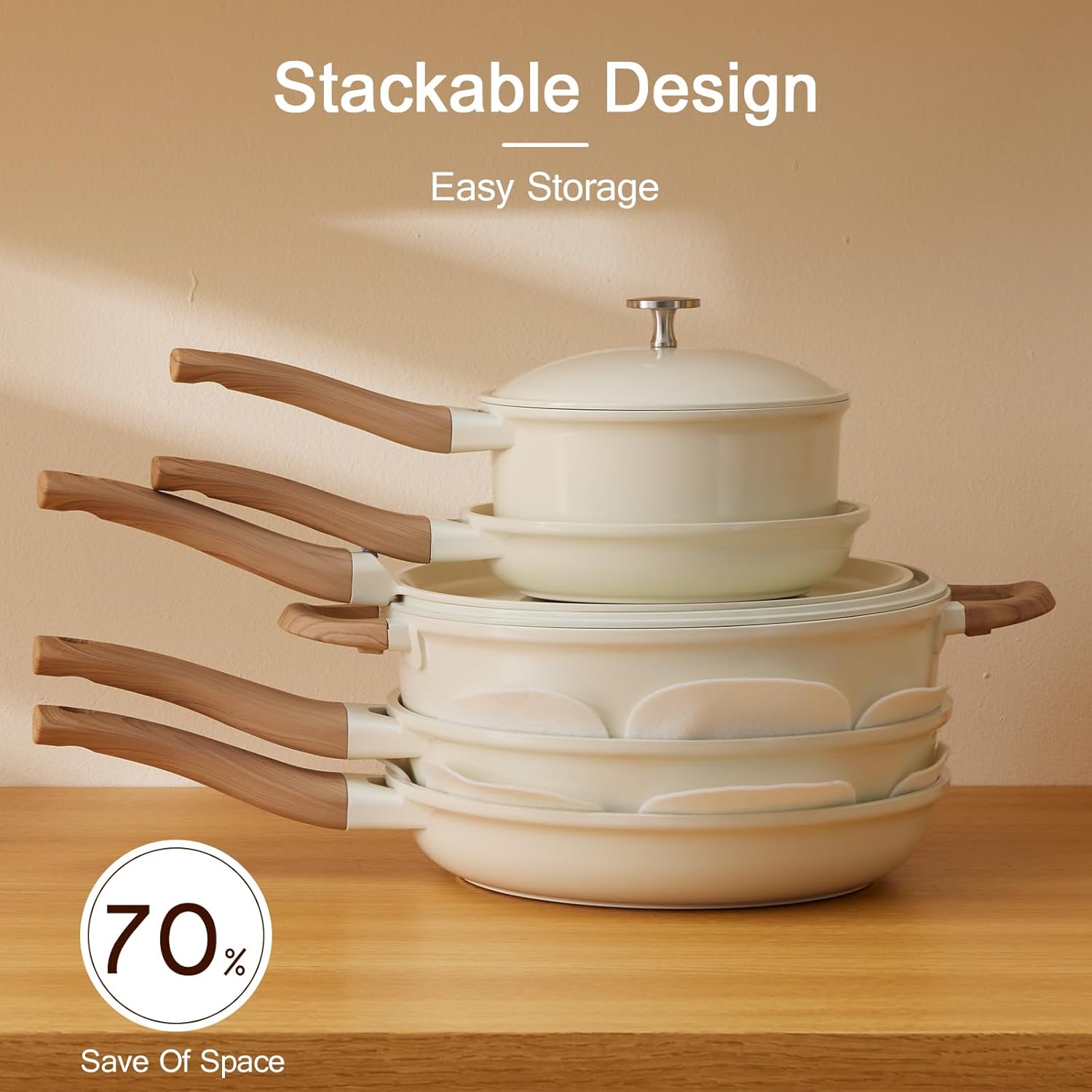 - 【Even Heating, Every Time】Designed for home chefs who demand speed and precision, this pots and pans set heats evenly with no hotspots, thanks to its extended bottom surface. Compatible with gas, electric, ceramic, and induction cooktops