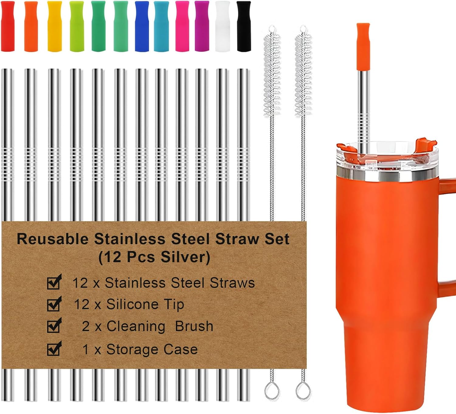 - BEST GIFT AND MOST COST EFFECTIVE SET: Includes 12stainless steel straws reusable, 12 silicone tips accessories for straws in different colors, 2 straw brushes, 1 storage box. stanley straws,Various cups perfect accessories for carrying on RV trips, outdoor activities or daily use
