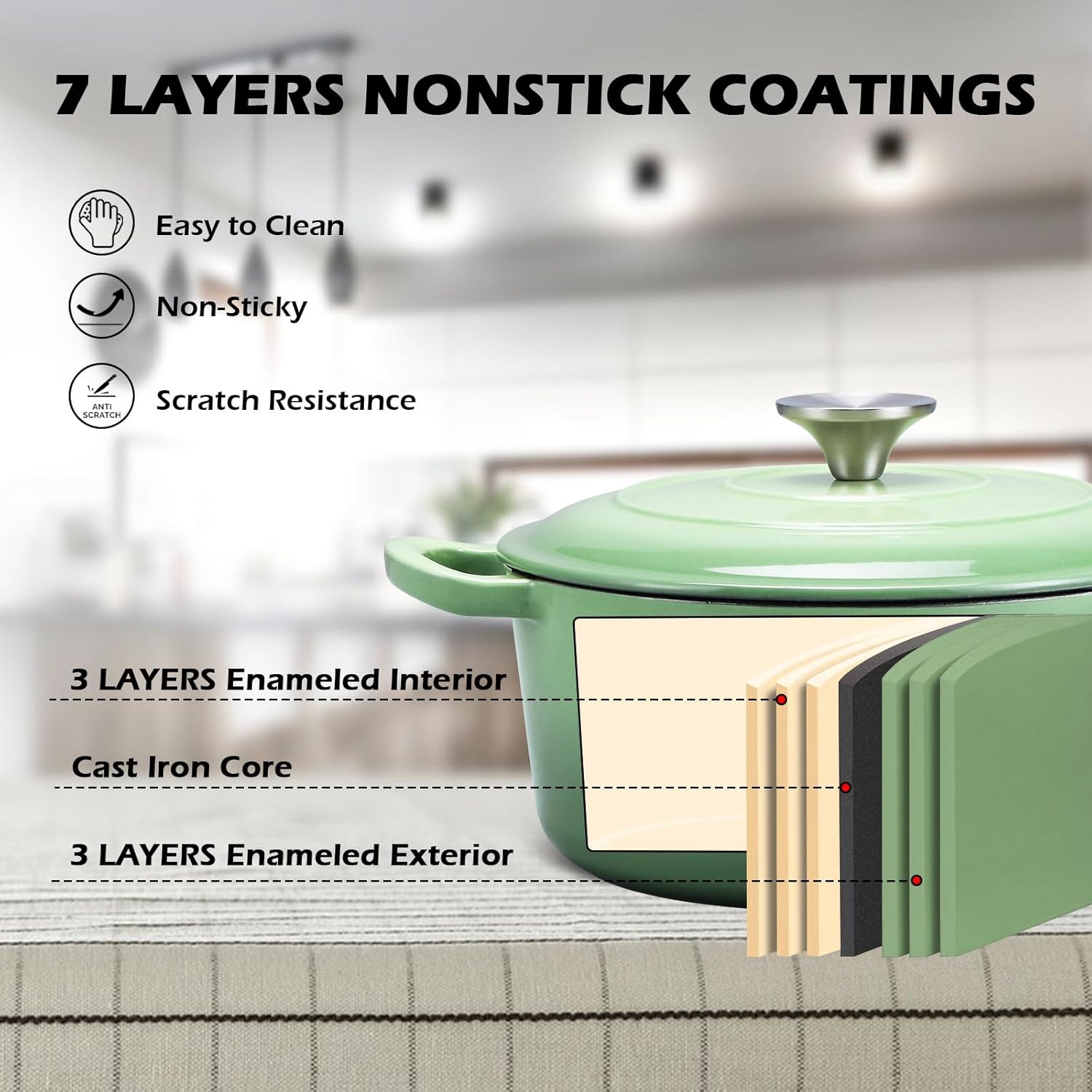 - Heavy Duty Material, Dutch oven pot with lid is made of 6 layers enamel and cast iron core layer, 4mm thickness pot wall with one-piece molding design enhance the strong construction without cracks or chips, high gloss enamel surface with no chemicals, form a layer of smooth coating to keep away from rusting and reduce food sticking