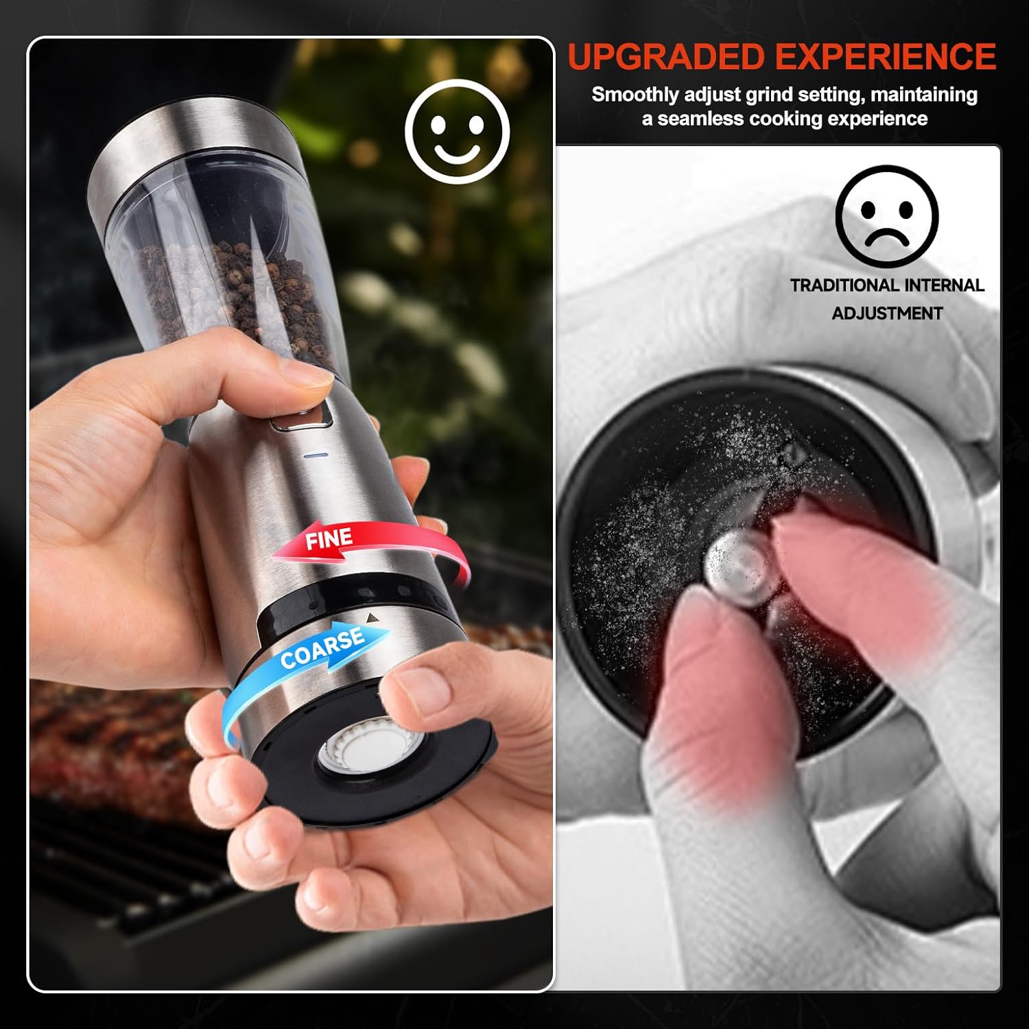 - 【Extra Large 5.07 oz Capacity】-electric salt and pepper grinder set has a generous 5.07 oz/150 ml capacity and a wide 2.0" opening, making spice refills effortless and less messy, catering to the needs of individuals and large families alike