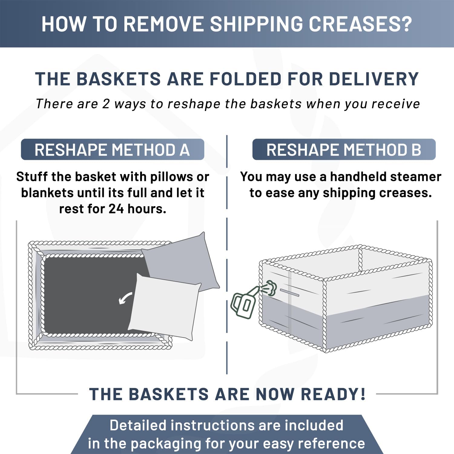 - Say goodbye to wrinkly, floppy baskets! Ours stays firm and structured—no permanent creases. Made with quality rope and a unique folding method, it’s easy to shape with the included instructions. Unlike others, it keeps its form beautifully.