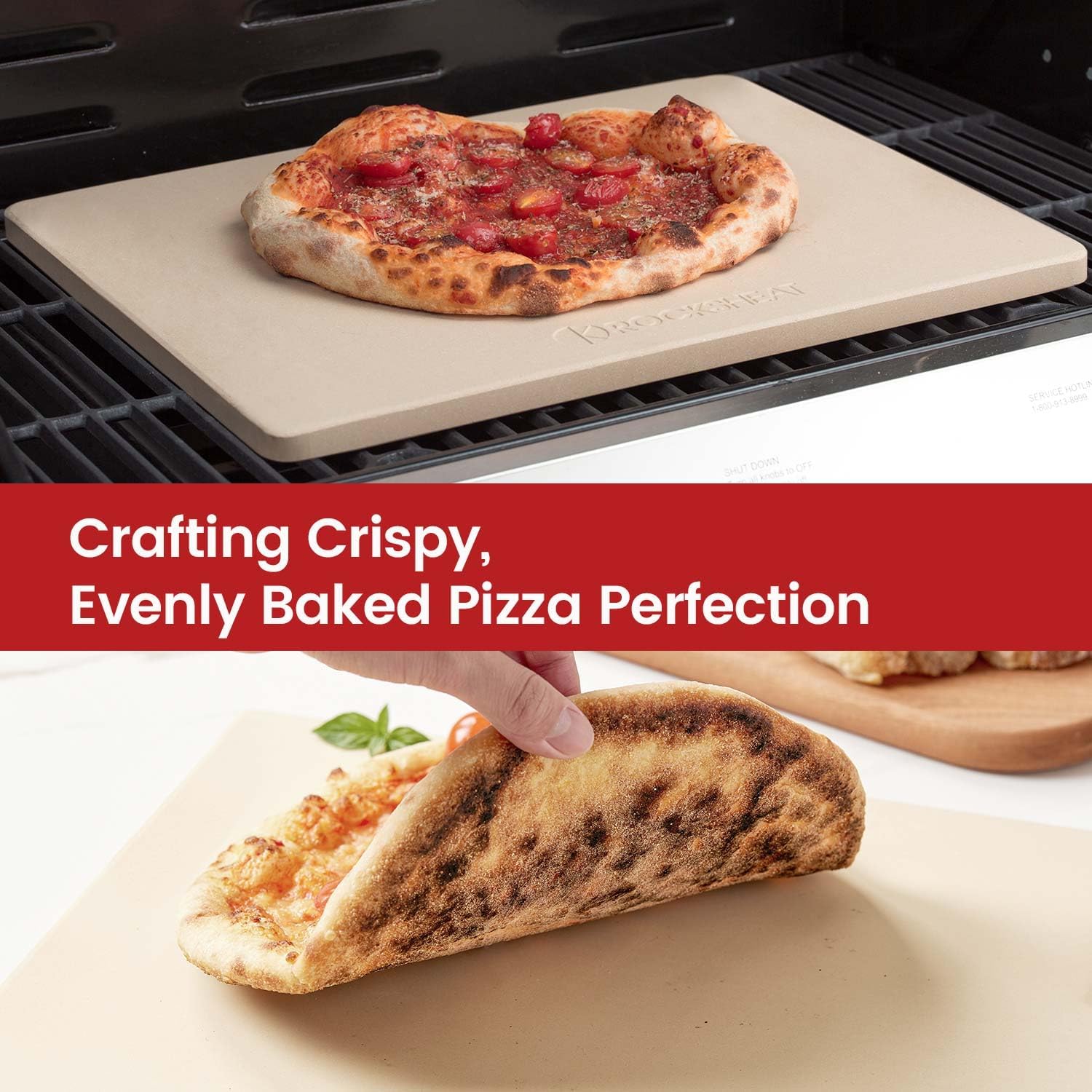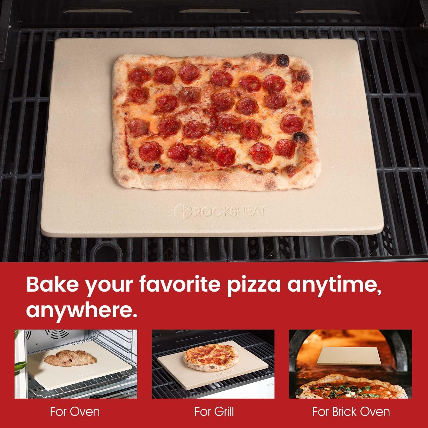 - ROCKSHEAT Rectangular 20" × 13.5” × 0.6" Pizza Stone, a versatile addition suitable for ovens, grills, and BBQs. Its generous size is perfect for 12-inch pizzas and a variety of other baked goods, making it an essential for home use and entertaining at pizza parties.