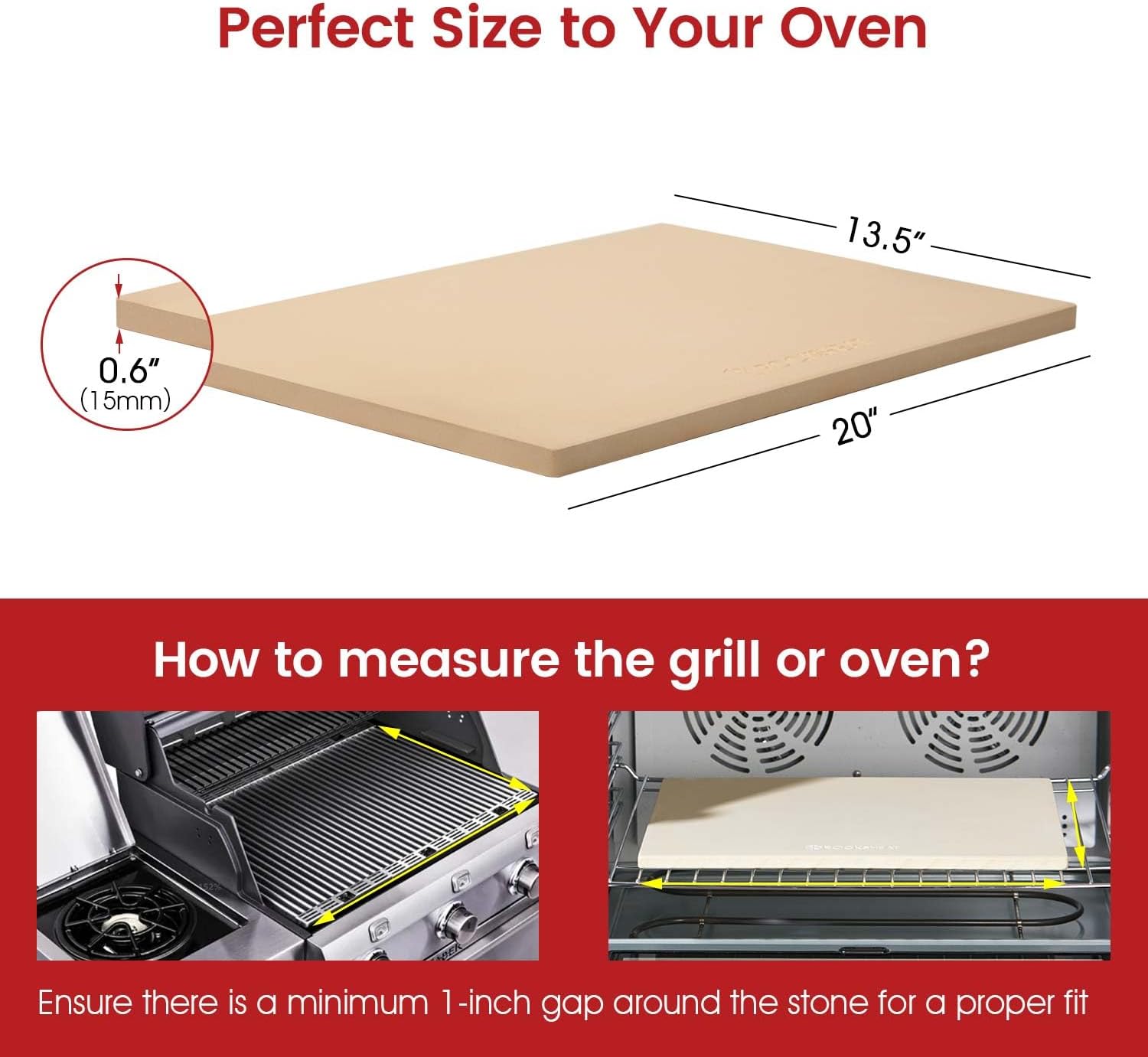 - Designed with an optimal thickness of 0.6" (15mm), this baking stone eliminates unnecessary weight and the need for prolonged preheating. Enjoy the convenience of quicker preheating and a more efficient baking experience.