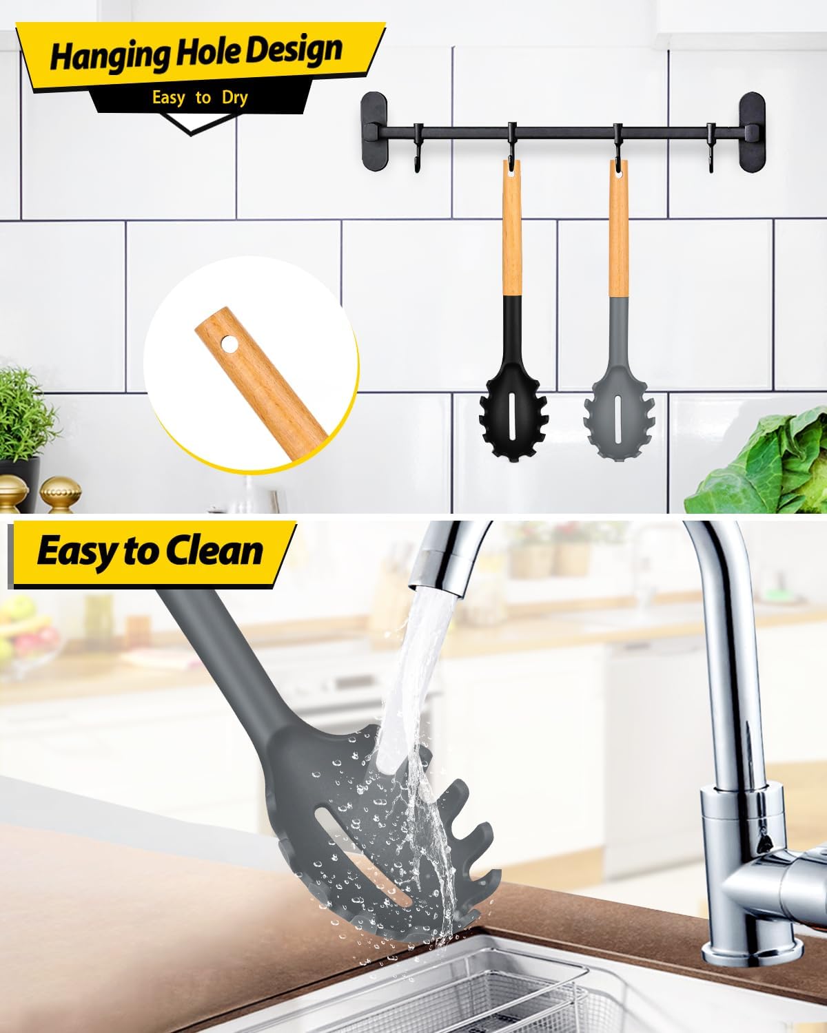 - More Safe and Healthy : Our spaghetti spoons are made of food-grade silicone, free of BPA;Even at high temperatures, there is no need to worry about melting or deforming;And the soft silicone head won't scratch the coating, it can better protect your pot