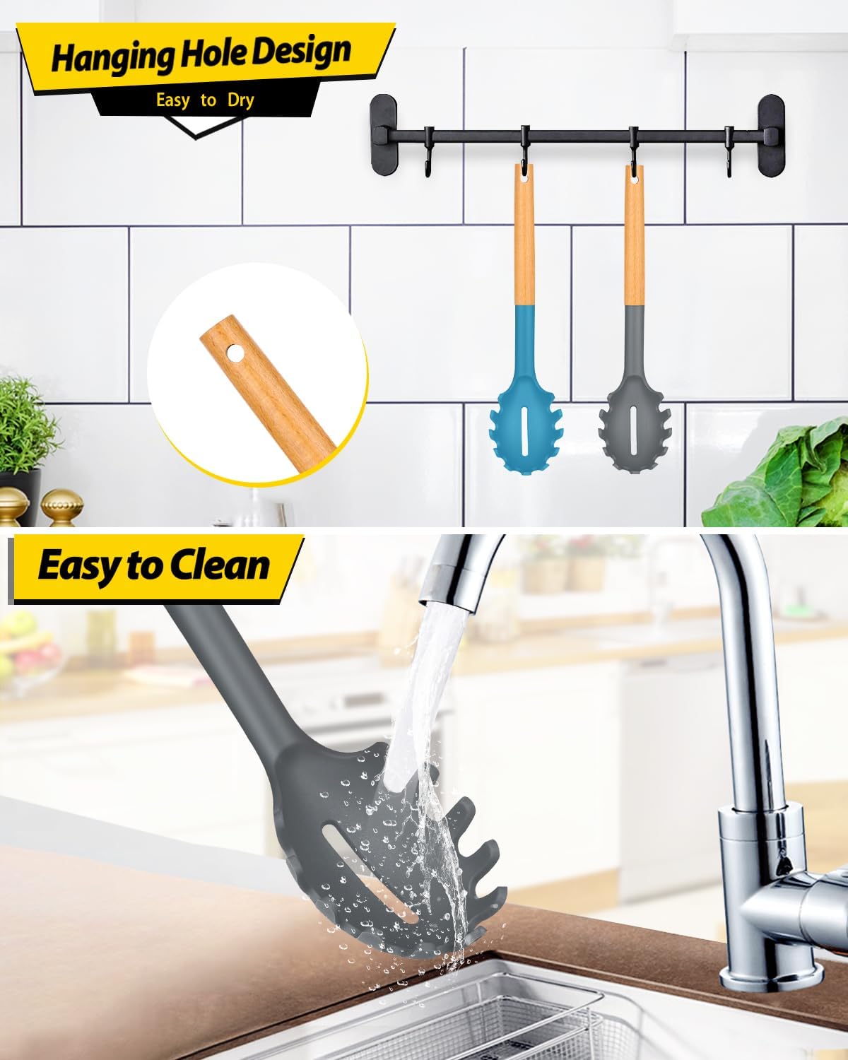 Pack of 2 Spaghetti Spoon, Silicone Pasta Fork with Wooden Handle, Heat Resistant Noodle Spoon Server, BPA Free Spaghetti Strainer(GRAY-BLUE)
