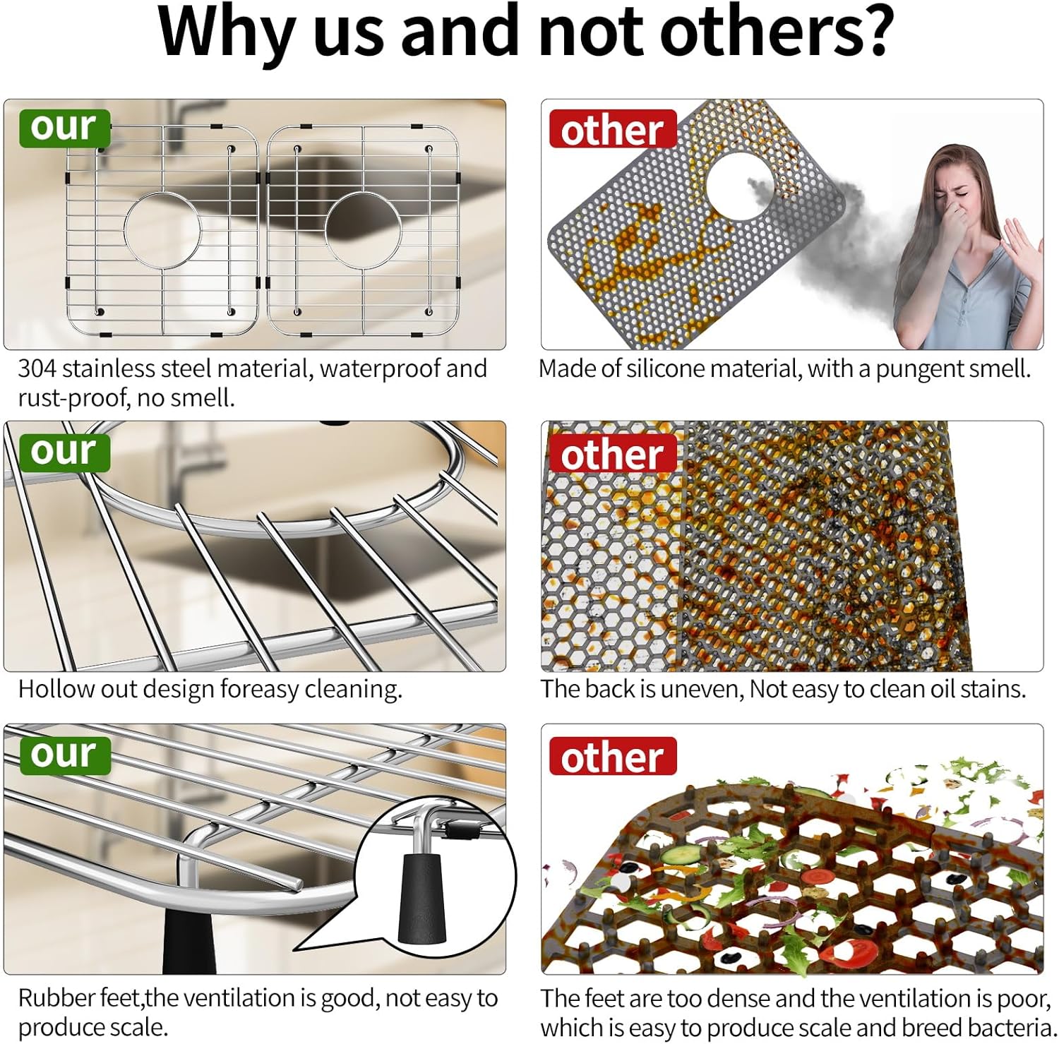- Unique Sink Protector Design: The sink mats for bottom of kitchen sink is designed with a hollow design, not touching the surface of the sink. The one-inch high rubber foot pads ensure that the bottom of the sink remains ventilated, making cleaning very convenient and preventing the accumulation of dirt and unpleasant odors.
