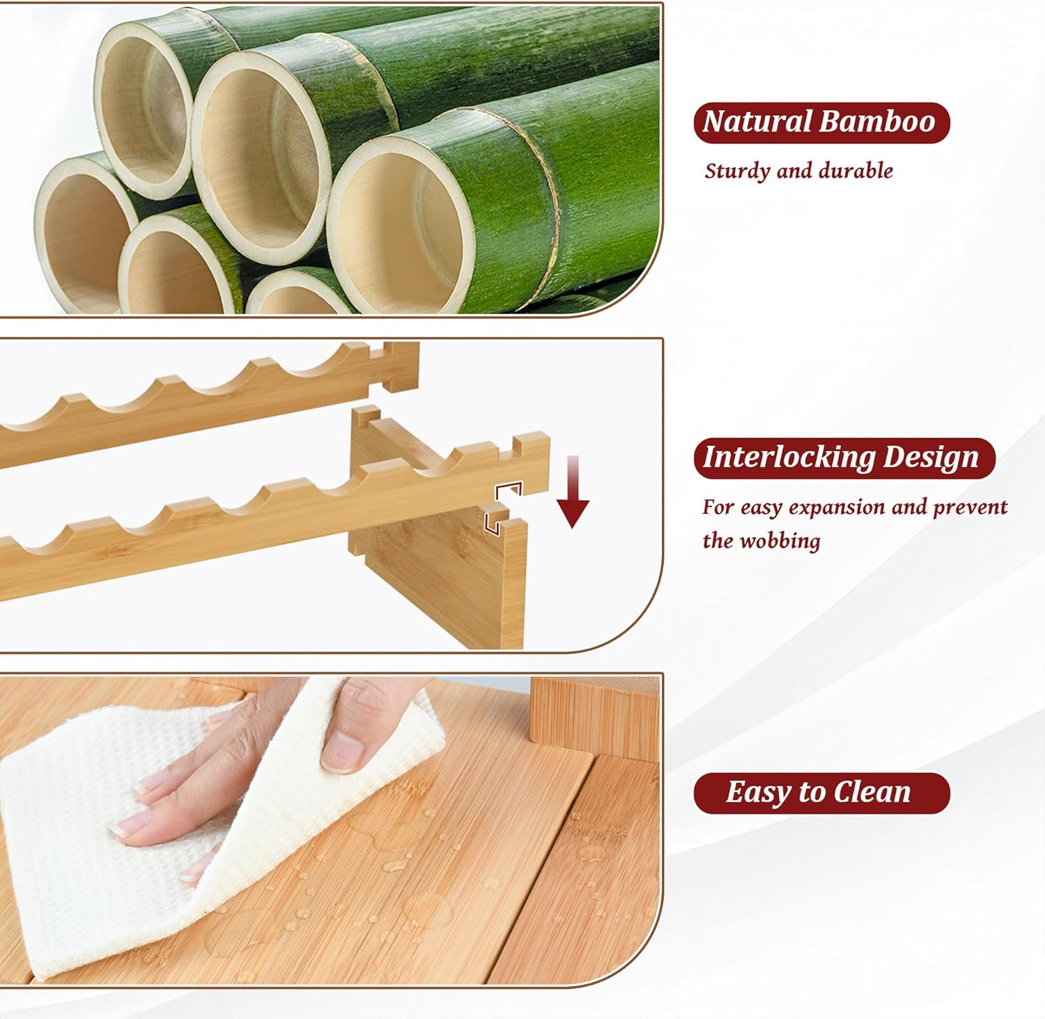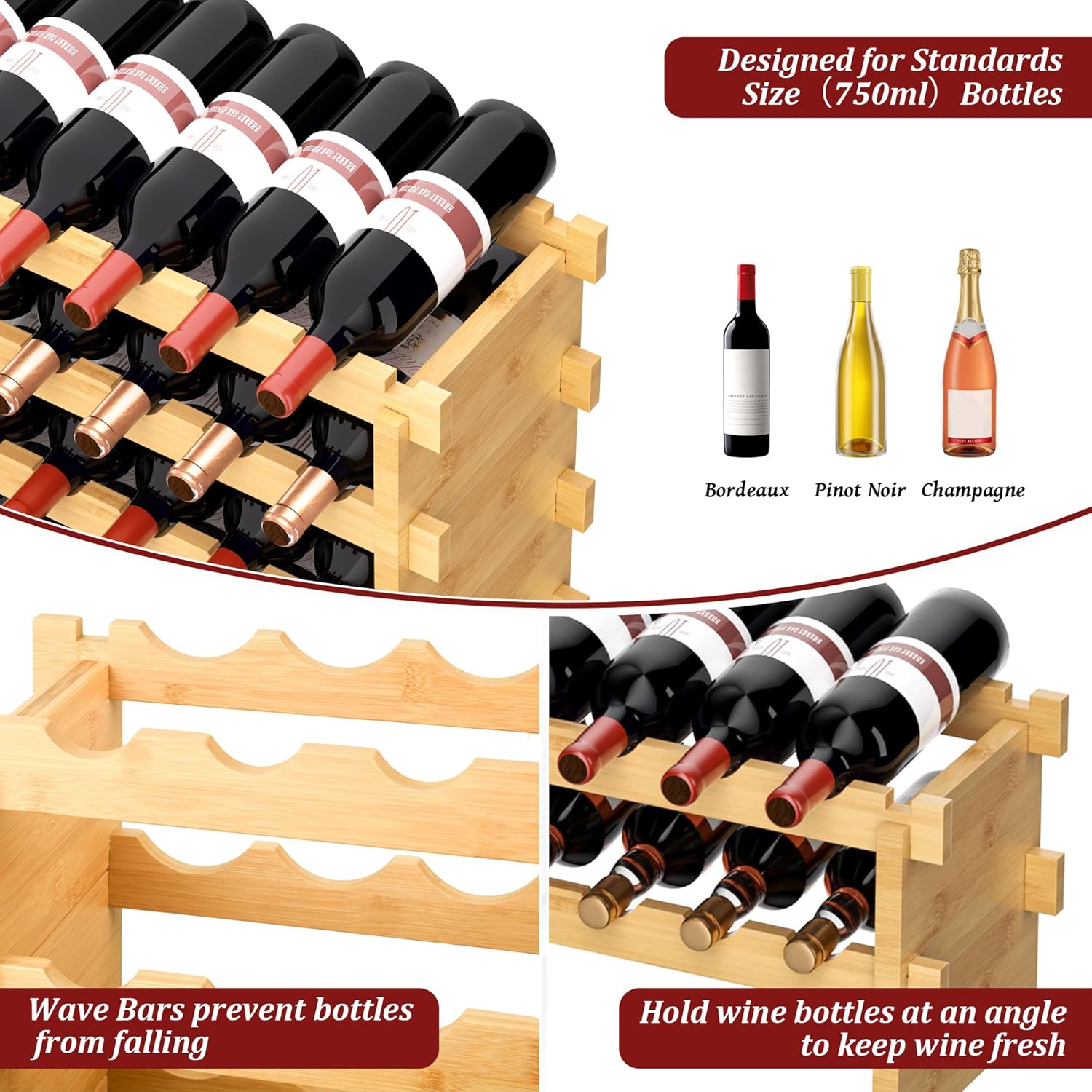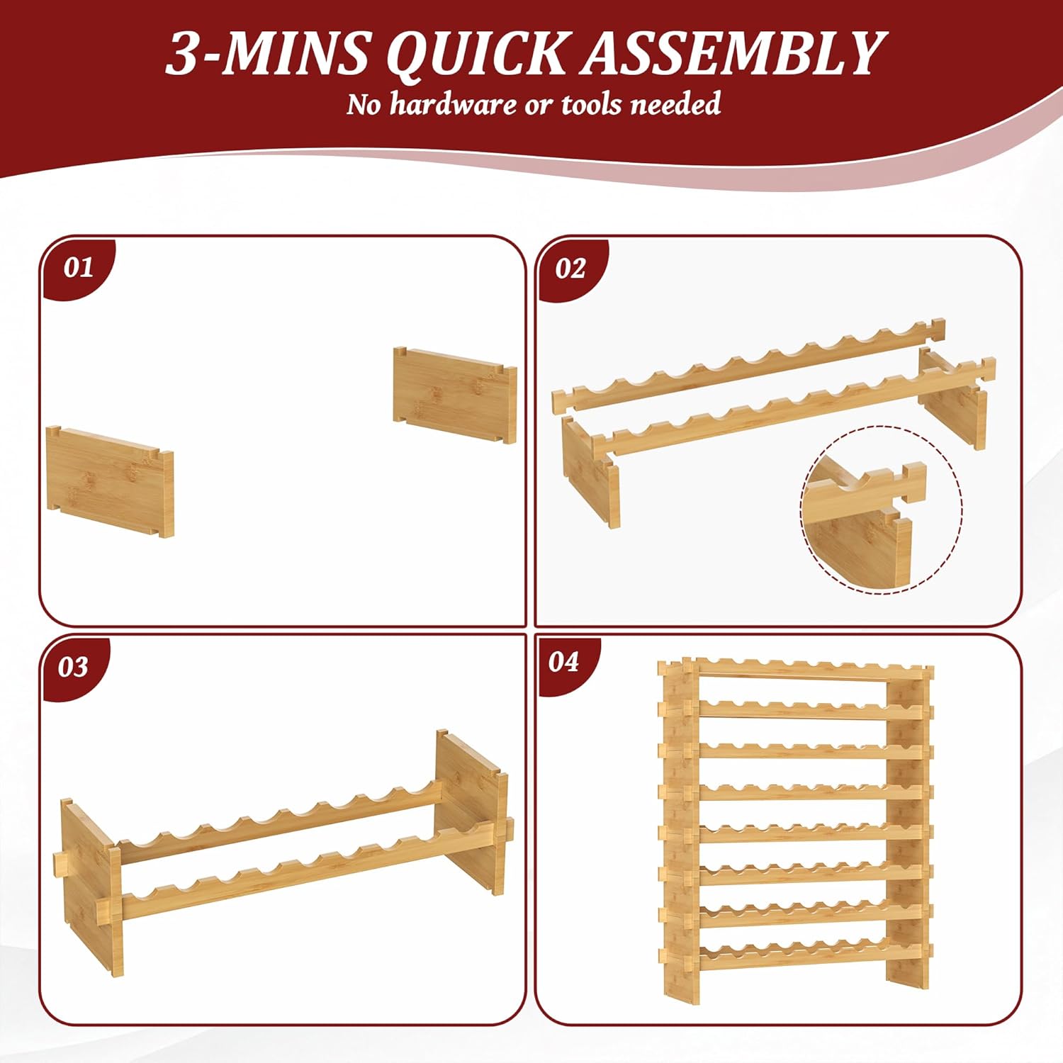 - 8 Tier Stackable Design: Features a layered structure stackable design. Each piece of the bamboo wood has notches & slots which are deep so they can fit together well, makes the wine display shelf more sturdy & wobble-free on the wood floor or the carpet
