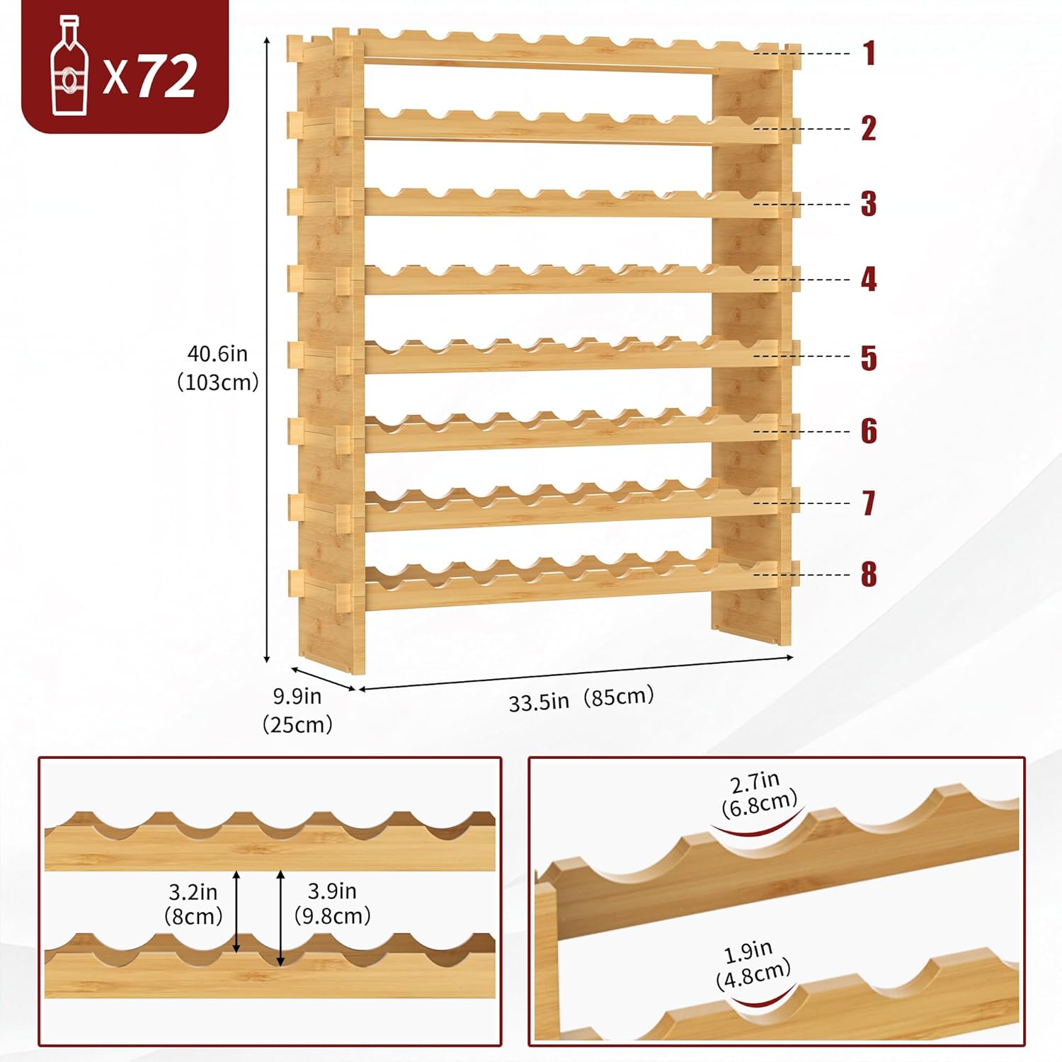 - Stackable Wine Rack for 72 Bottles: This stackable modular wine rack measures approximately 33.5 W x 9.9 D x 40.6 H inches, accommodating up to 72 bottles with 8 tiers and 9 bottles per layer. Its flexible design fits seamlessly into kitchens, dining rooms, or wine cellars. Ideal as a thoughtful gift for wine enthusiasts and collectors.