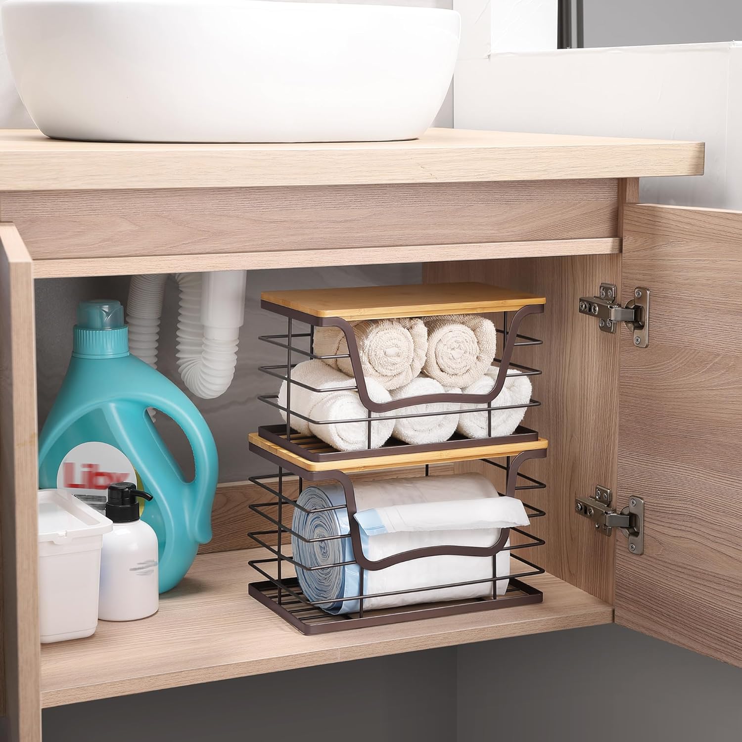 Trash Bag Dispenser Holder for Kitchen 2 Pack Brown Finish Garbage Bag Organizer Wall Mount Stackable Bin with Bamboo Lid for Countertop, Under Sink, Laundry Room