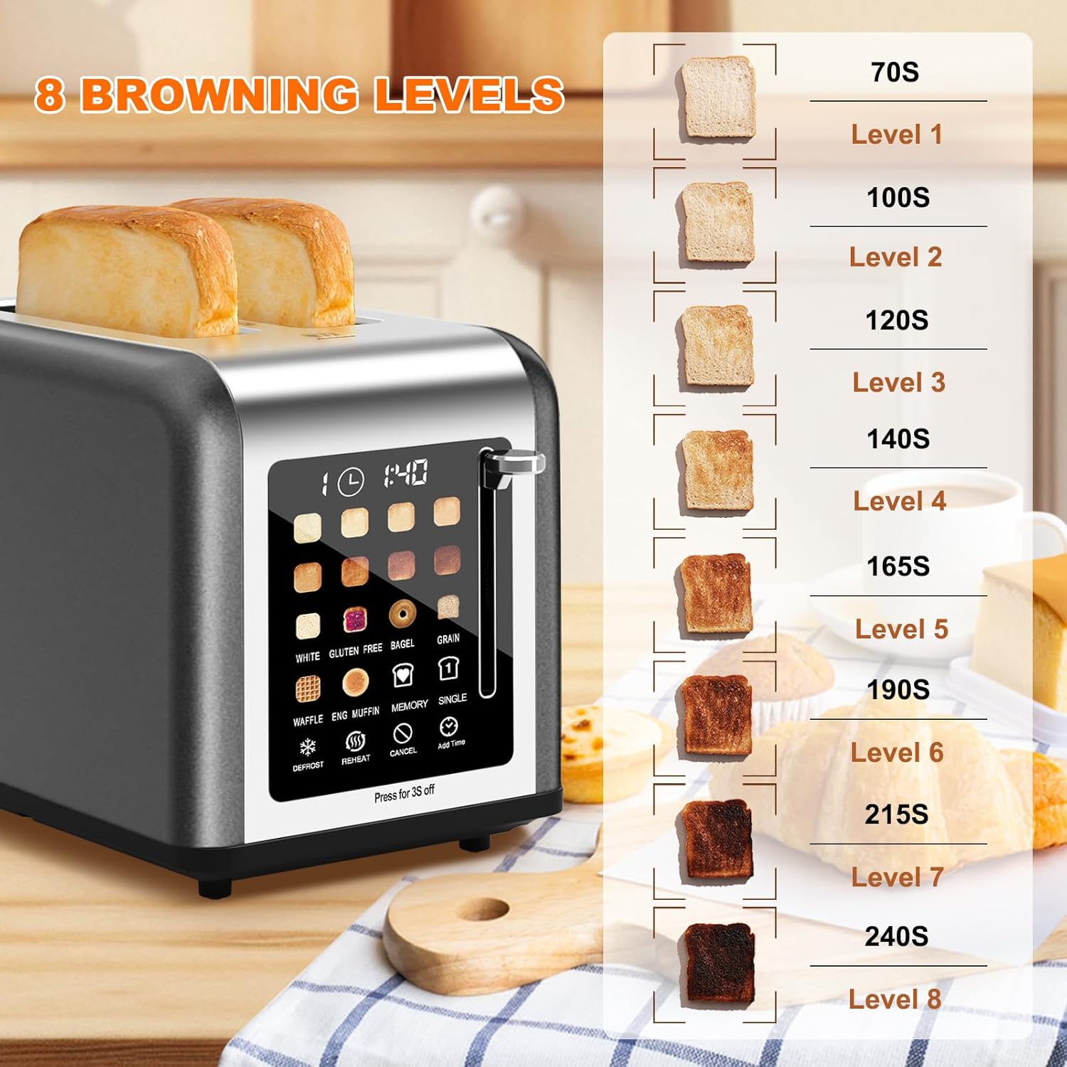 - Digital Display & Touch Screen: The 2 slice toaster has a large to digital display to show the shade setting, bread type and countdown. You can keep track of the remaining time with the visual countdown display on the touch screen control panel.