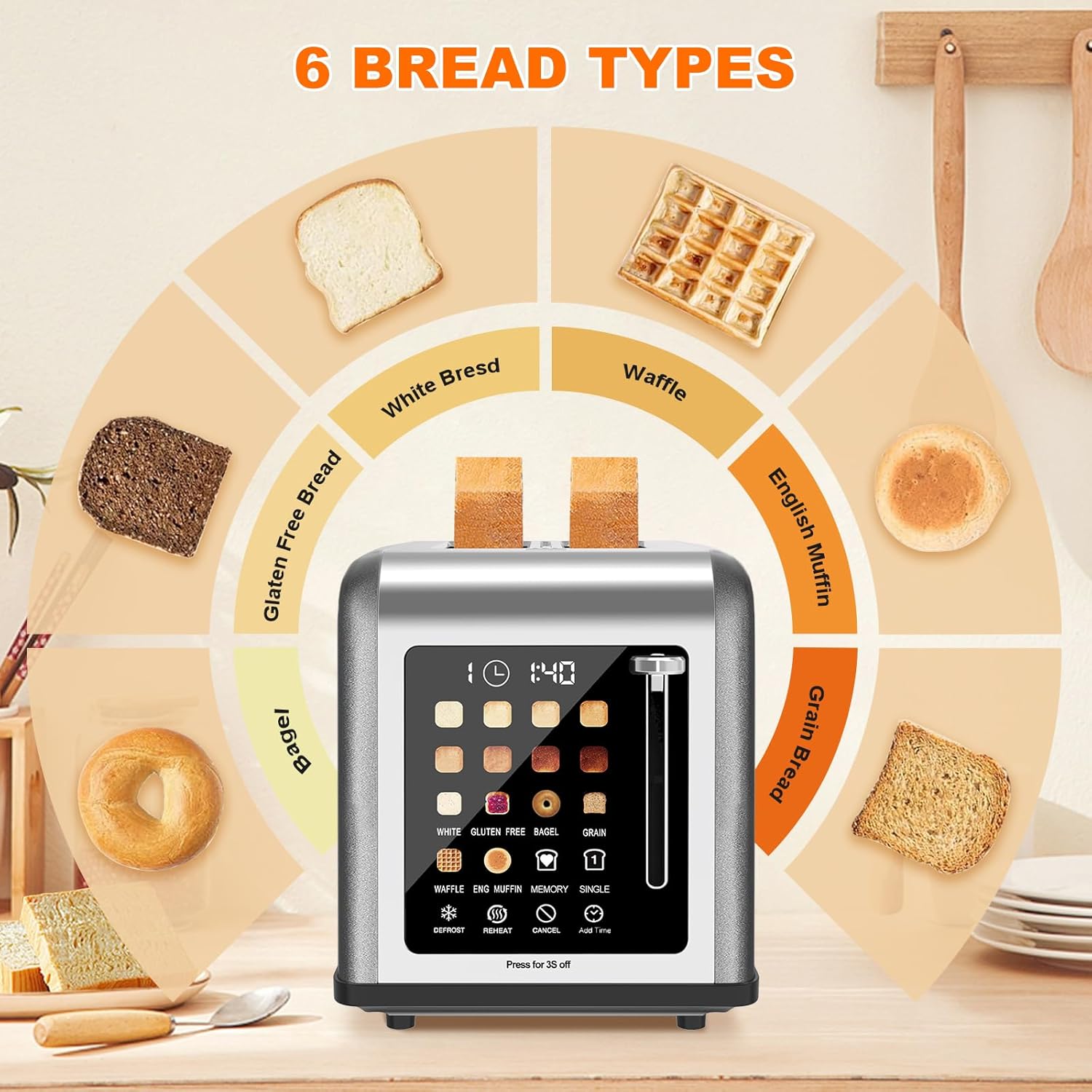 - Peculiar Functions: Except Cancel, Defrost, Reheat functions, we specially added Bread Type, Memory, Sigle slot to toast, Add Time functions. 6 bread type including bagel, white, waffle, eng.muffin, gluten free, grain.