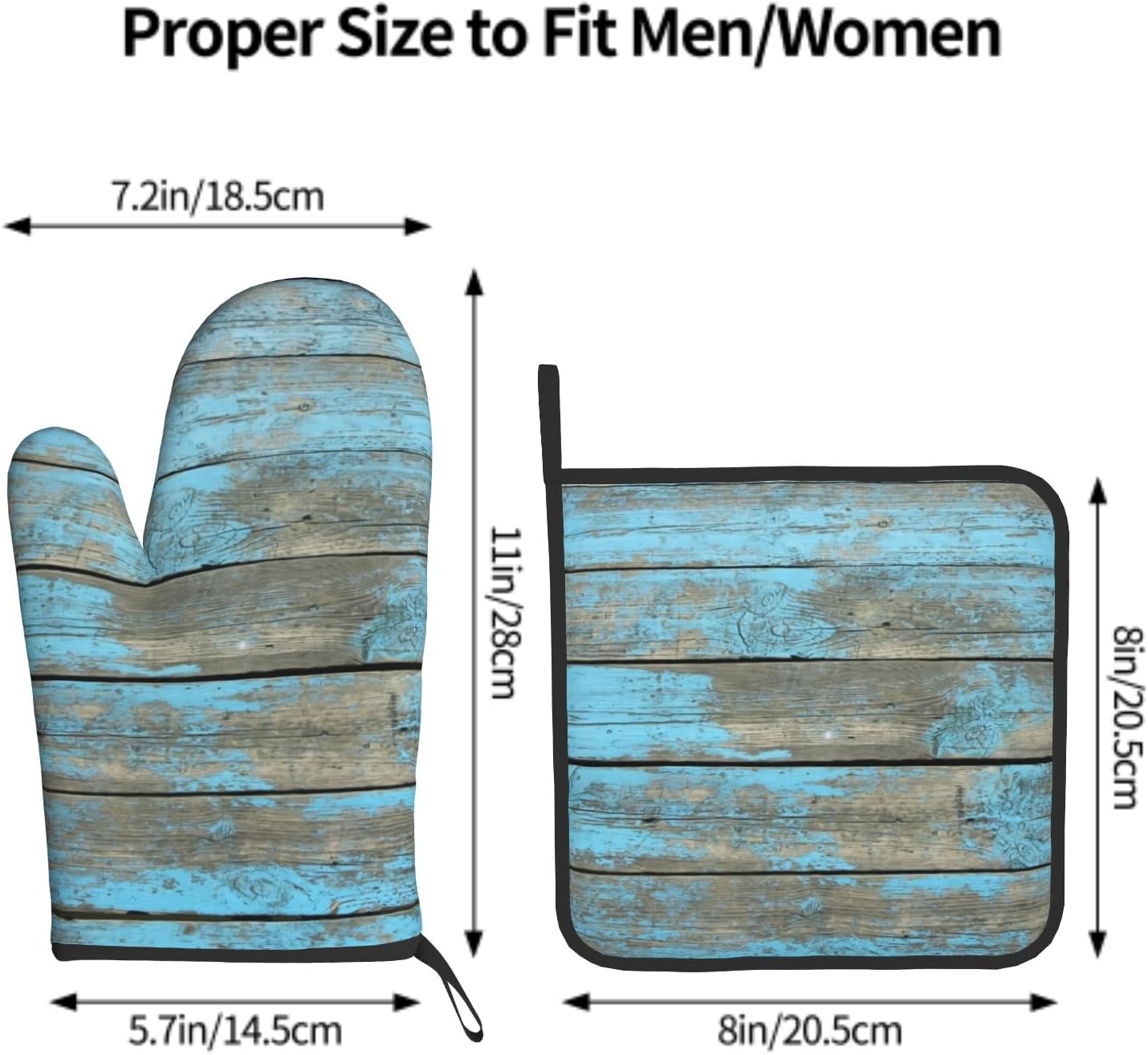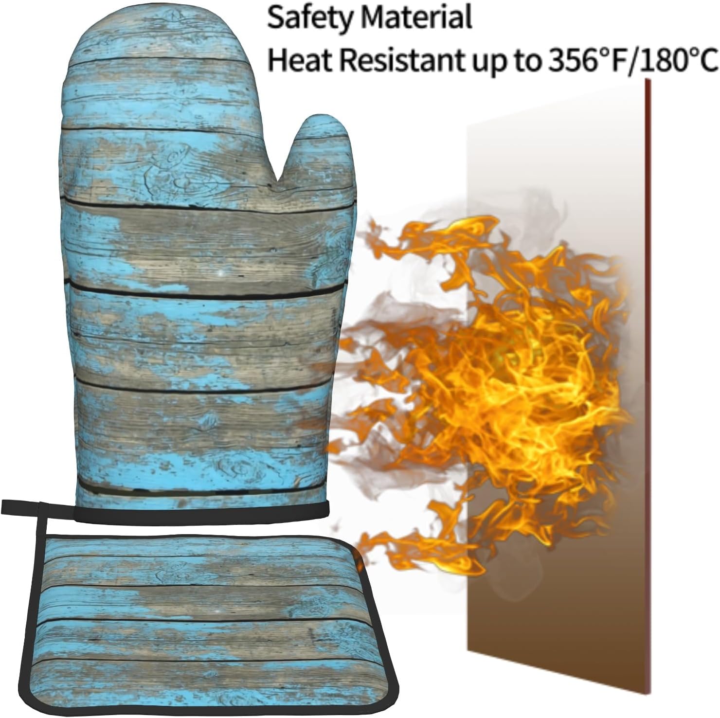 Blue Wood Oven Mitts and Pot Holder Set of 2 Rustic Board Heat Resistant Gloves Hot Potholders Kitchen Decor for Cooking Grilling Baking