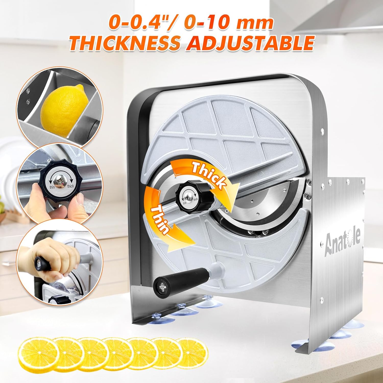 Anatole Commercial Vegetable Slicer Stainless Steel 0-0.4'' Thickness Adjustable Manual Veggie Fruit Cutter for Tomato Onion Potato Cabbage Lime Orange