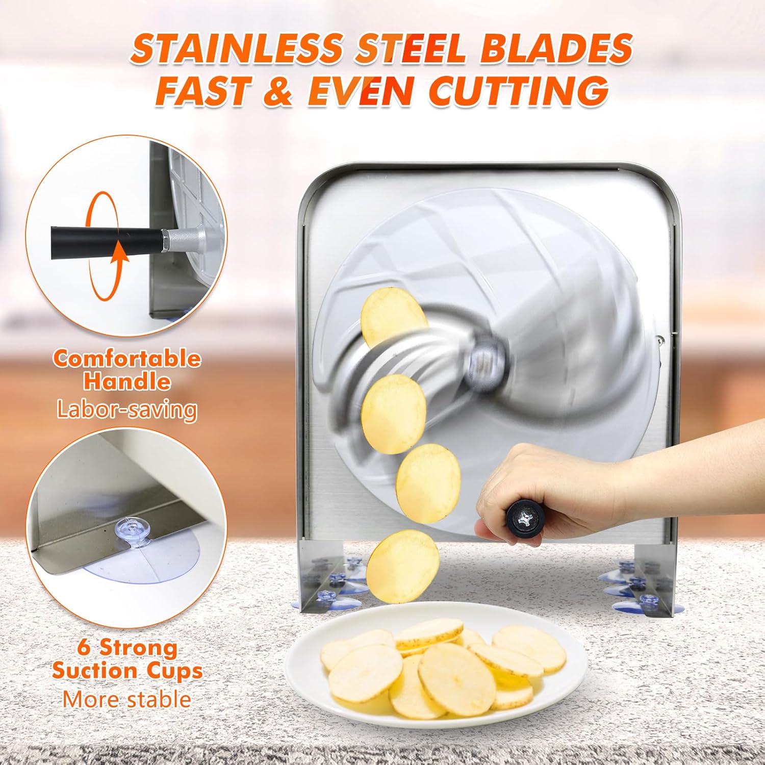 - Fast & Even Cutting: Comfortable handle ensures effortless cutting; 6 powerful suction cups ensure stability during use; the professional slicing machine cuts quickly and evenly, greatly improving efficiency