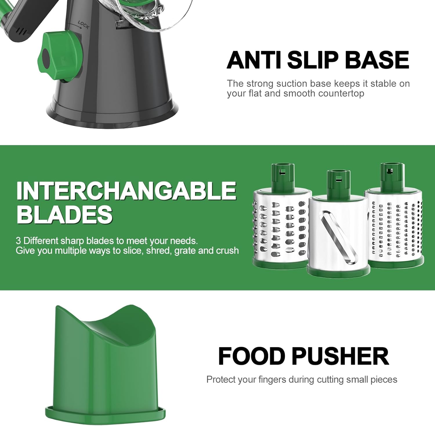 Cambom Rotary Cheese Grater Hand Crank Cheese Shredder for Fresh Cheese, Vegetable, Nuts,Non-slip Suction Base, Free Cleaning Brush Three Blades, Grey and Green