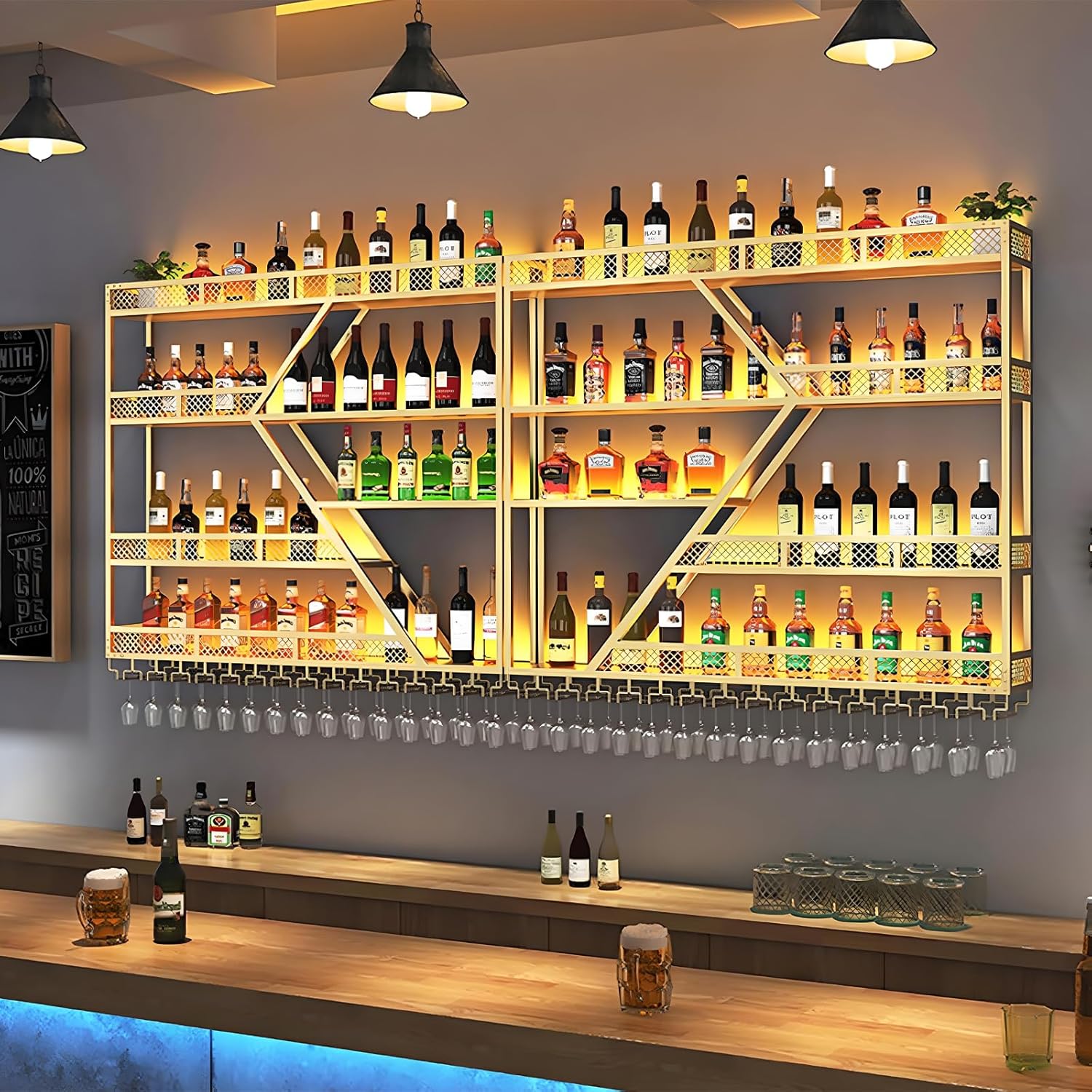 94.48in Metal Wine Rack Wall Mounted, Modern Wine Storage Rack Wall Mounted with Wine Glass Holder, Liquor Shelf, Bar Shelves for Liquor Bottles (4 Tiers Gold, 94.48 * 7.87 * 33.85INCH)