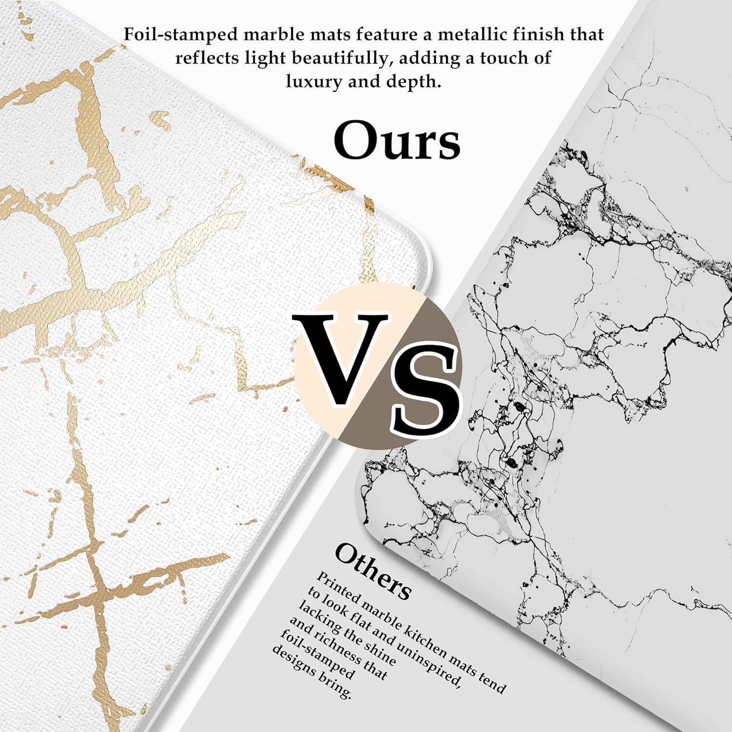 Gold Foil Stamped Marble Kitchen Mats for Floor 2PCS Cushioned Anti Fatigue Non Slip Waterproof Comfort Leather Kitchen Rugs 2/5 Inch PVC Kitchen Mats for Sink, Laundry, 17.3"x28"+17.3"x59",White