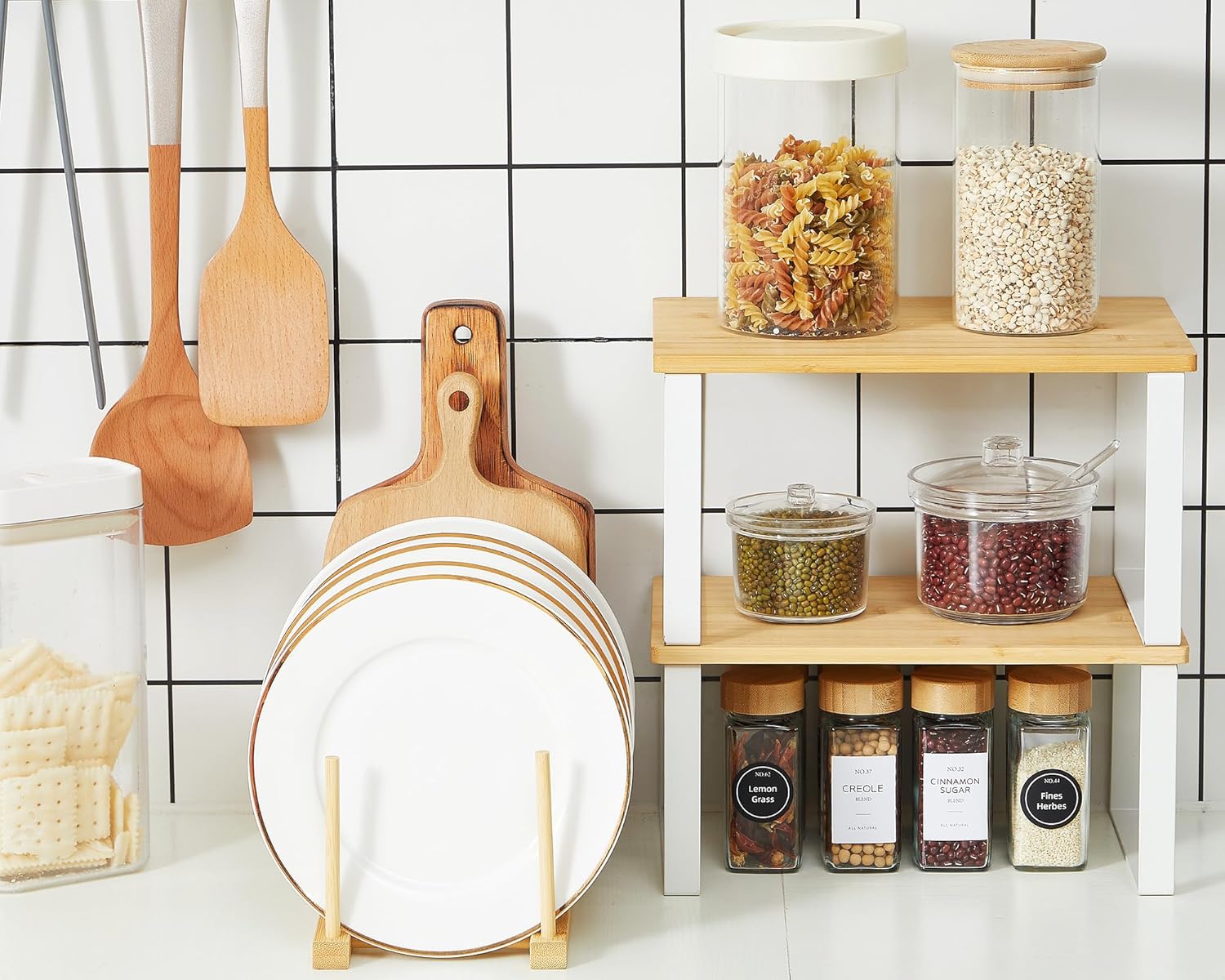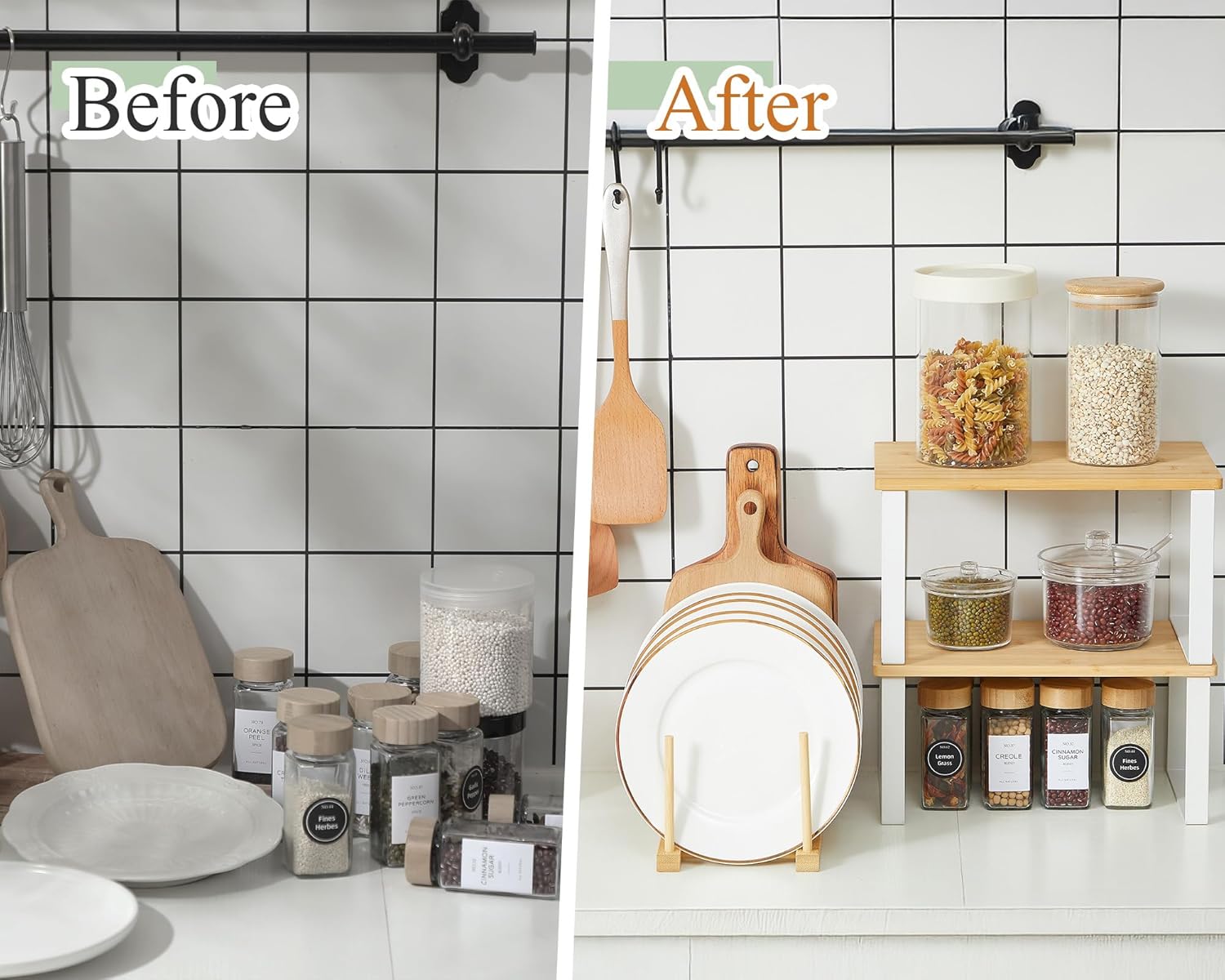 - Quality Material: these plate racks are made of quality natural bamboo, ensuring durability, allowing you to get in close contact with nature; These spice rack organizer made of quality wood and metal and can be stacked
