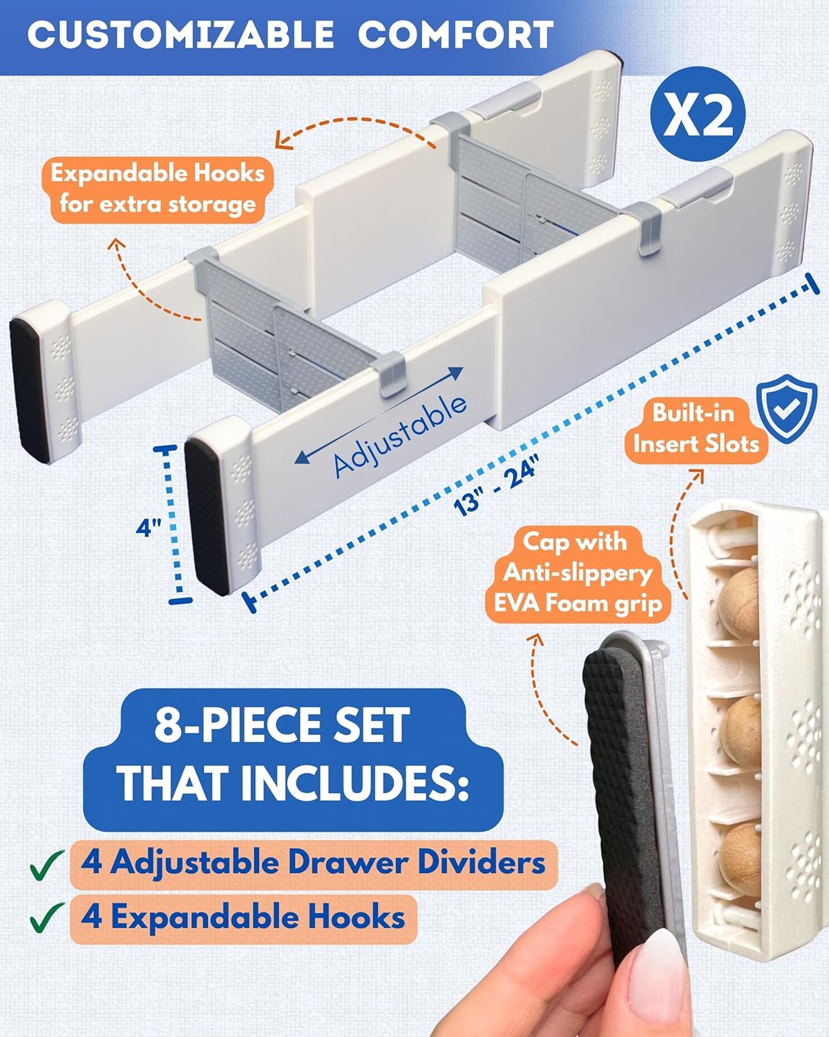 - INCREDIBLY VERSATILE: The dresser dividers conform to any storing space, which makes them great for bedroom, kitchen, office, vanity, bathroom, or nursery. Use them as closet shelf, desk, or kitchen drawer divider for hassle-free organization.