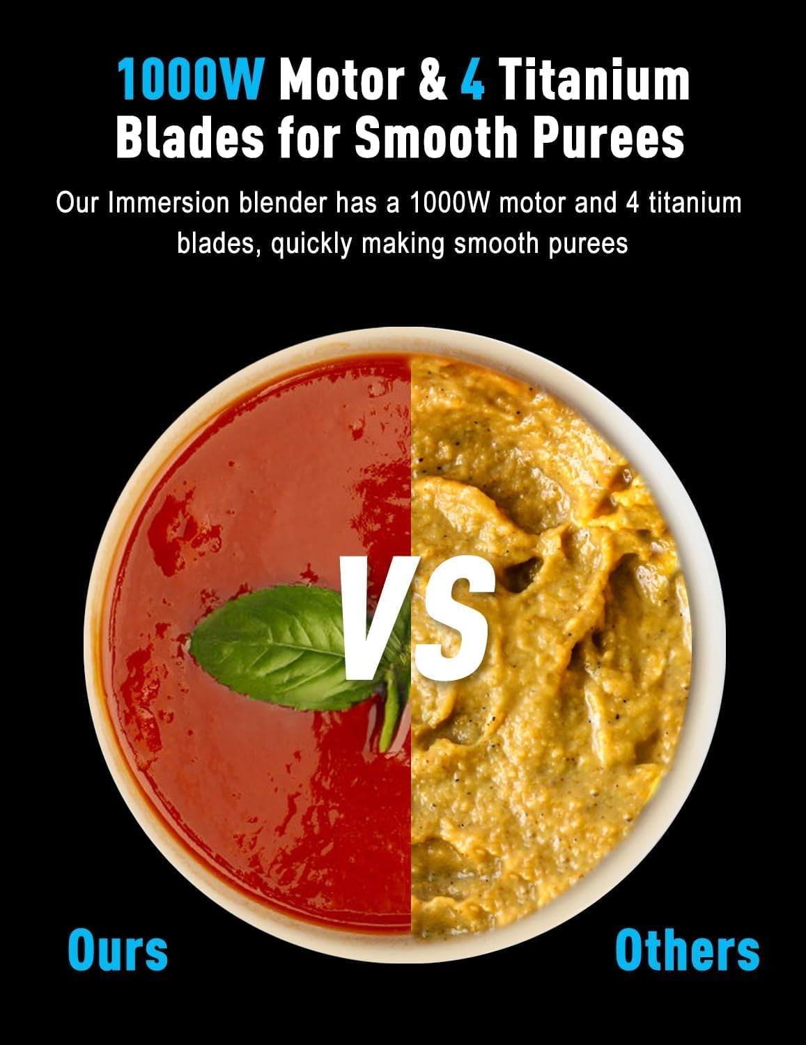 - 【4-Blade Titanium Head】Our immersion blender features a 4-blade titanium head for superior performance. Compared to standard 2-blade designs, it blends more efficiently, This cutting-edge design not only improves blending efficiency but also extends the lifespan of the blades, making it a reliable choice for all your culinary needs.