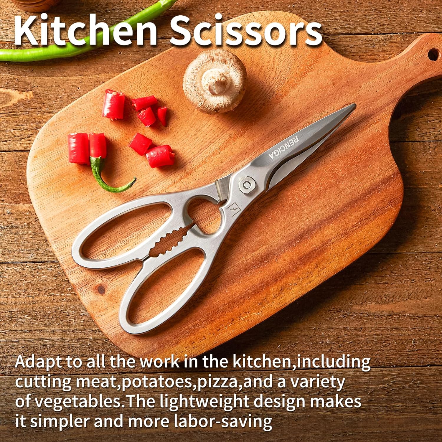 - Scope of use: High quality hardened stainless steel kitchen shears easily cut through cardboard, twine, food, meat, vegetables, chicken, poultry, fish, herbs, seafood. Applied to travel, family camping, BBQ, restaurant food packing bags and more. Great as Food Scissors, Meat Scissors, Cooking Scissors, Scissors Kitchen, Cooking Shears, Poultry Scissors, Utility Scissors, Meat Cutting Scissors.