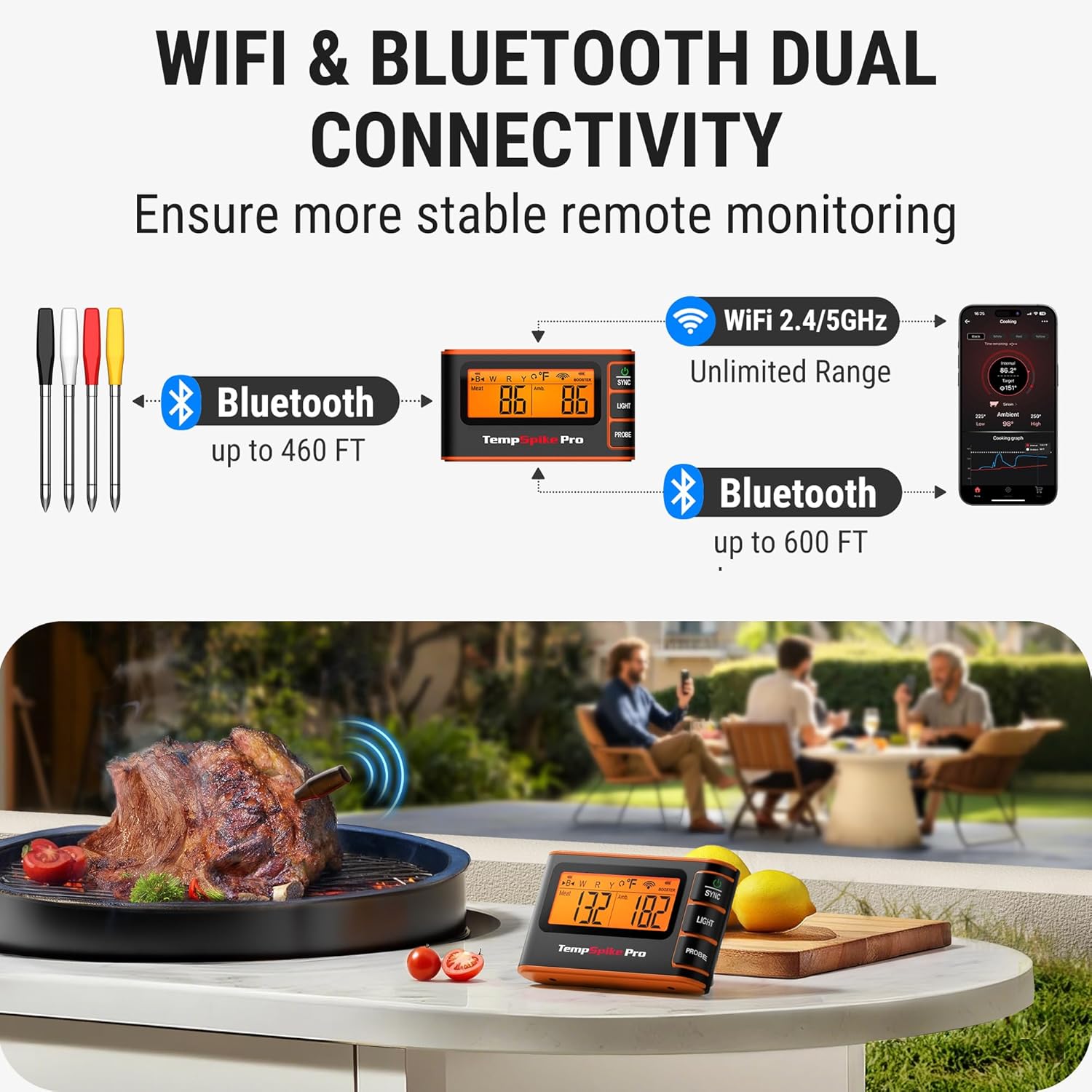 ThermoPro TempSpike Wireless Meat Thermometer Bluetooth,WiFi Unlimited Range, Detachable Thiner Meat Probe with1050°F Heat Resistance, Cooking Food Thermometer for Grilling BBQ Smoker, Orange