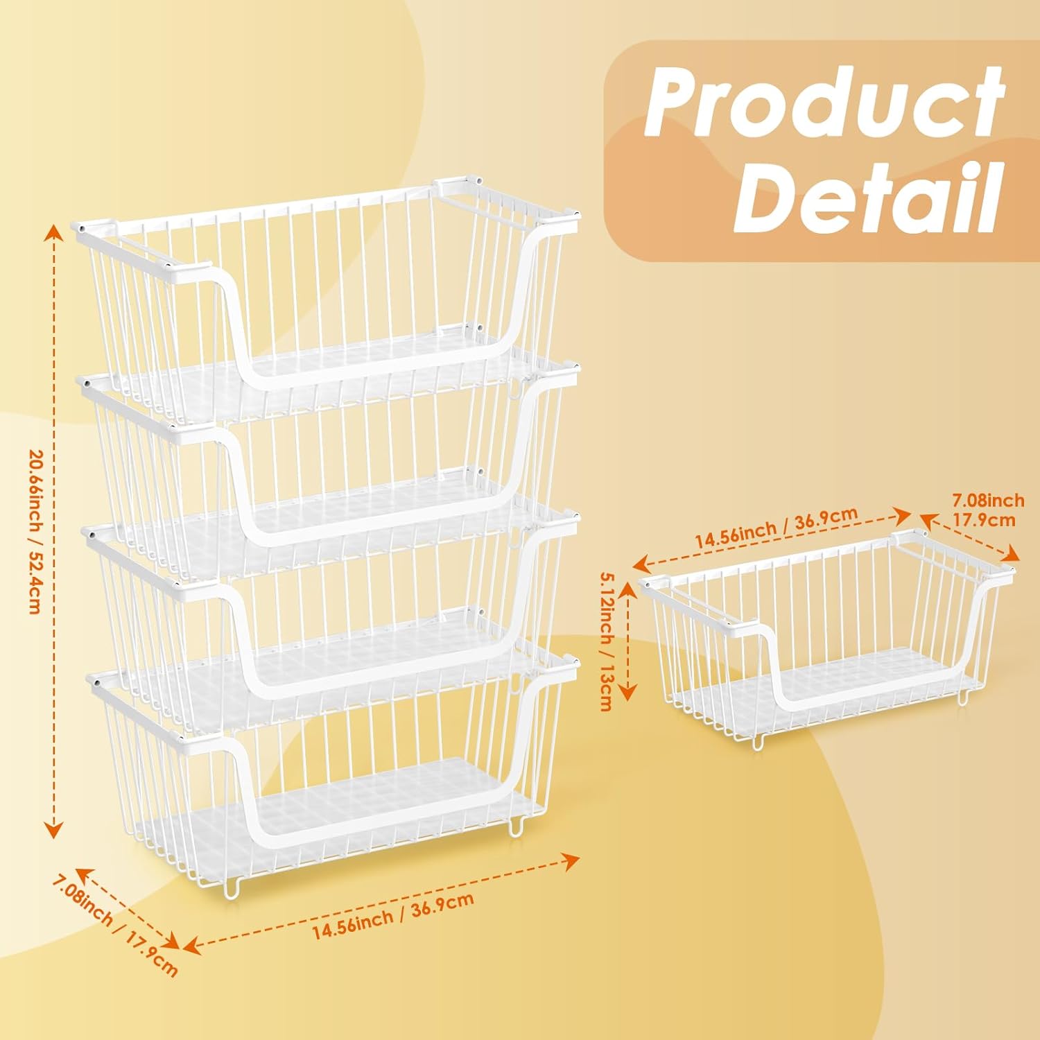 - STACKABLE DESIGN:These 4 stackable wire baskets offer flexible use: individually or stacked together.No installation needed.The innovative rotating handle serves a dual purpose: it supports metal baskets securely when stacked and acts as a comfortable handle for easy transport from your kitchen counter or pantry.Ideal for pantry storage, snack organizer and organizing food, miscellaneous items, they help create a clutter-free home.