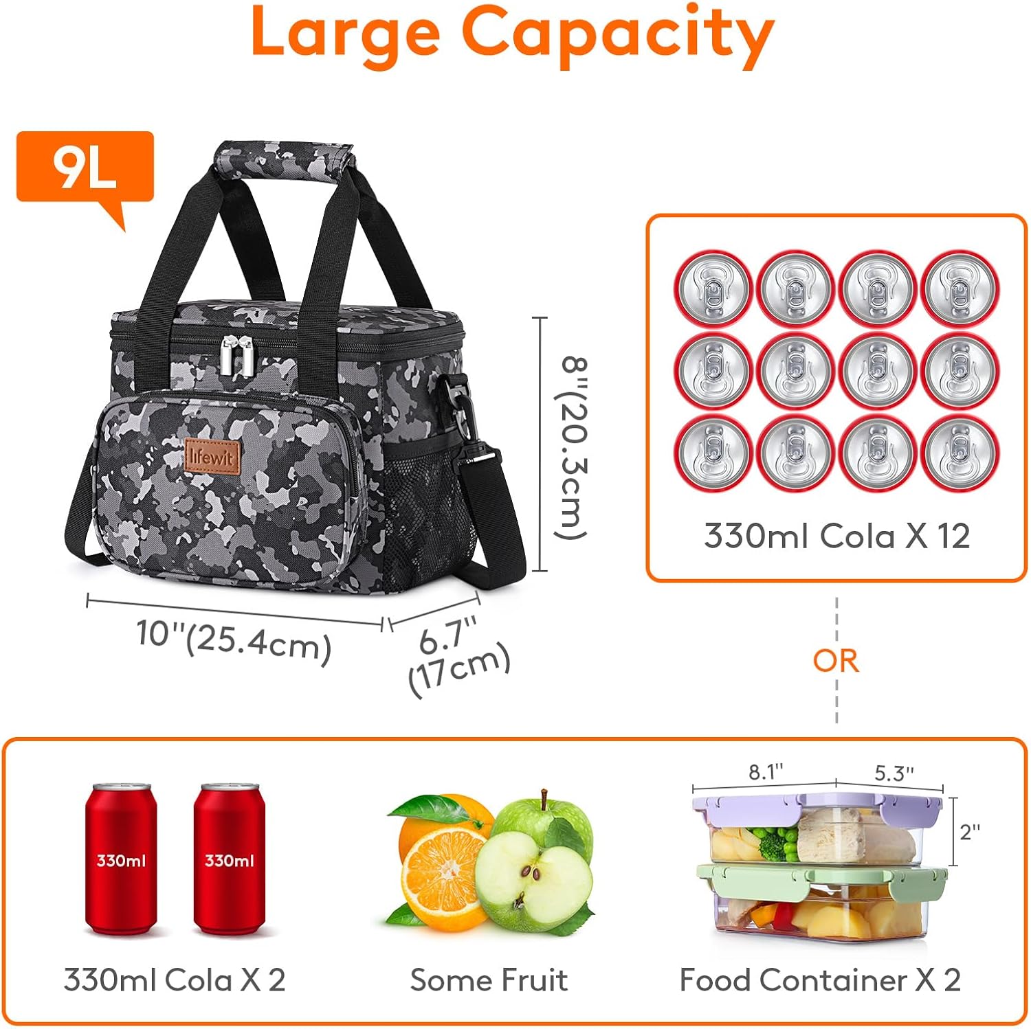Lifewit Medium Lunch Bag Insulated Lunch Box Soft Cooler Cooling Tote for Adult Men Women, Black Camo 12-Can (9L)