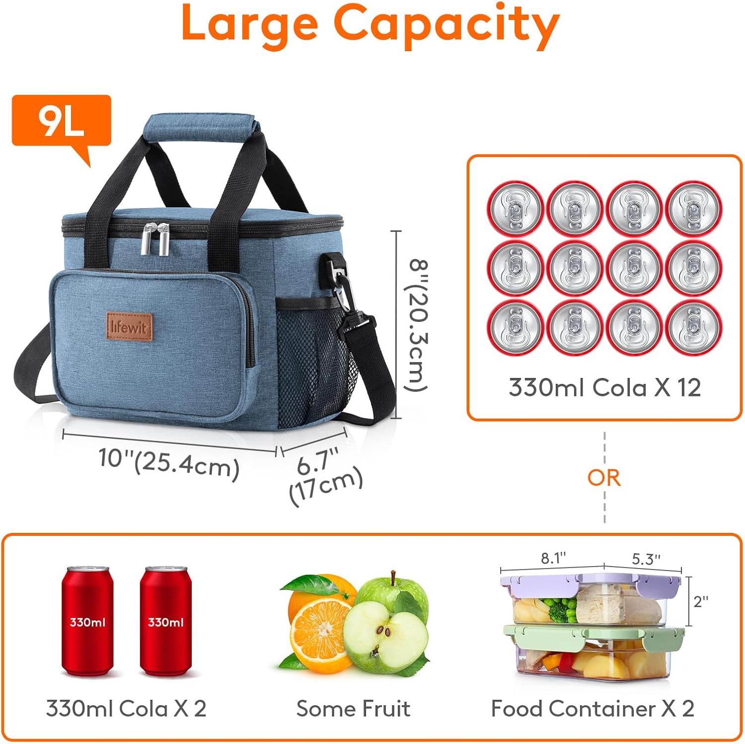 - Large Capacity: Dimensions - 10"(25.4cm) Γ 6.7"(17cm) Γ 8"(20.3cm). The maximum capacity of lunchbox for adults is 9L, and is spacious enough to store 12 cans of coke (330ml), or your lunch such as sandwiches, salad, snacks, drinks and fruits and so on. It is suitable for office, for work, picnic, beach, trip.