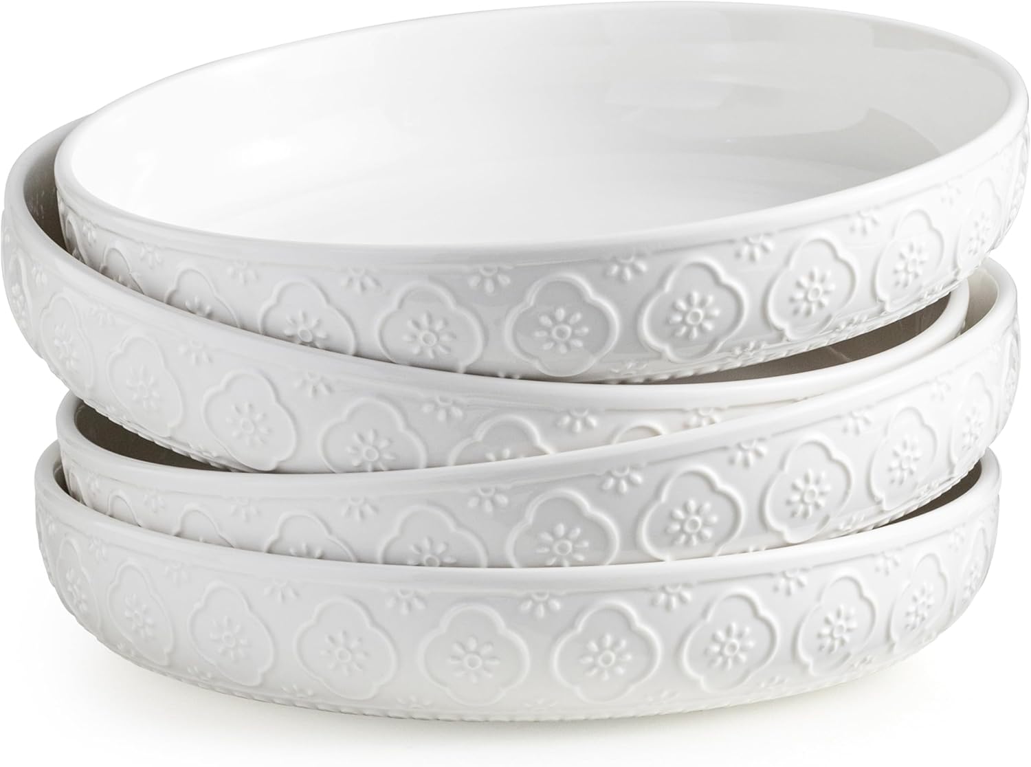 YHOSSEUN 9.75" Pasta Bowls Set of 4, 50 OZ Large Salad Serving Bowls, Ceramic Pasta Plate Bowls, White Soup Bowl, Microwavable Dinner Bowls for Kitchen, Embossed Sunflower
