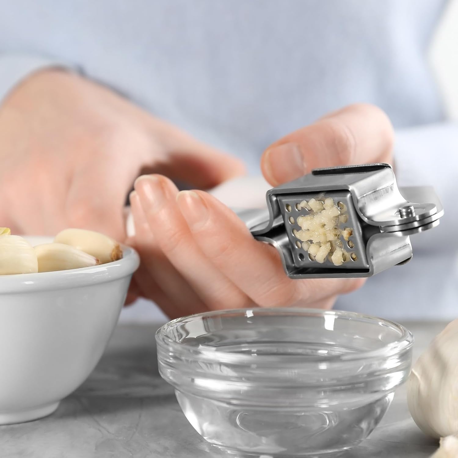 - Easy To Use - Open the garlic press and position the garlic cloves into the grooves. Firmly depress the garlic press downward to extract the garlic paste or slices.