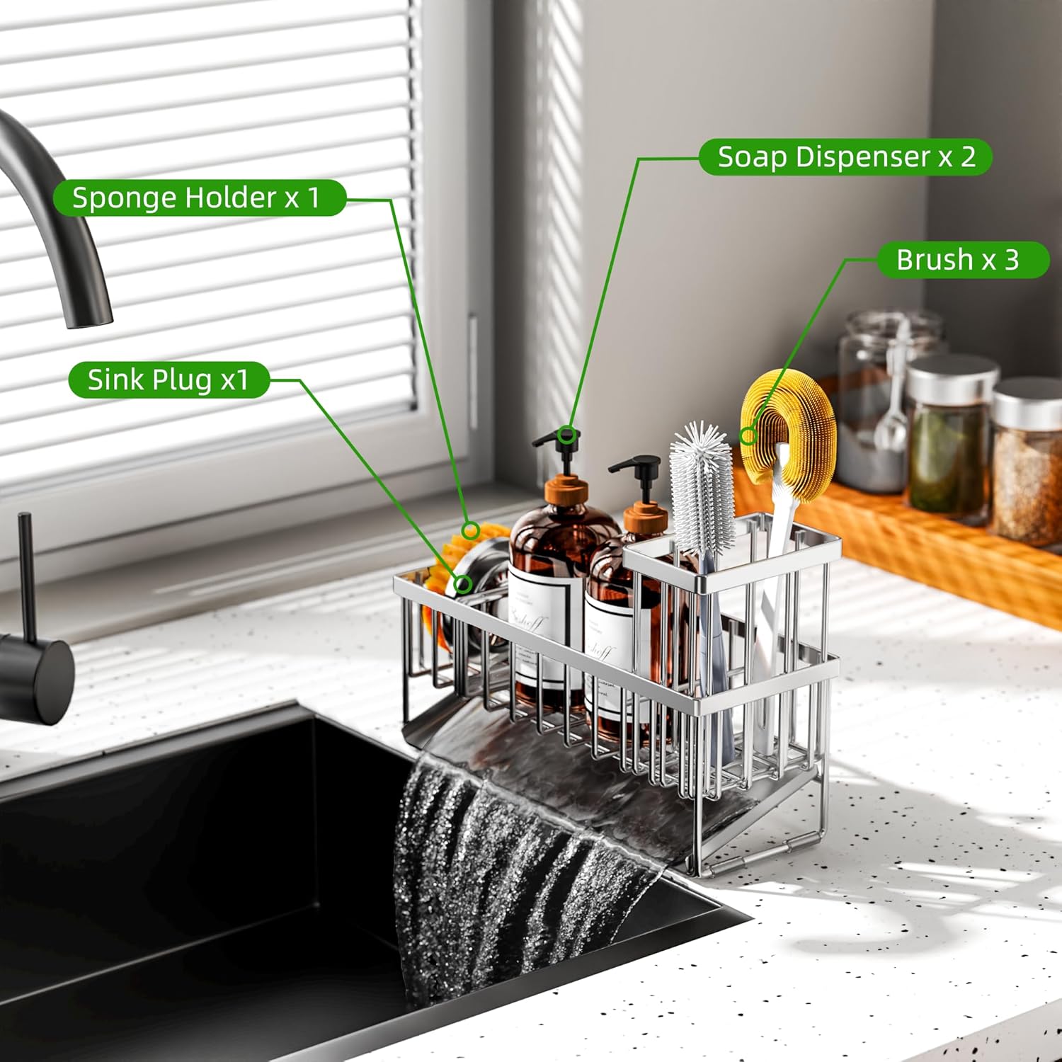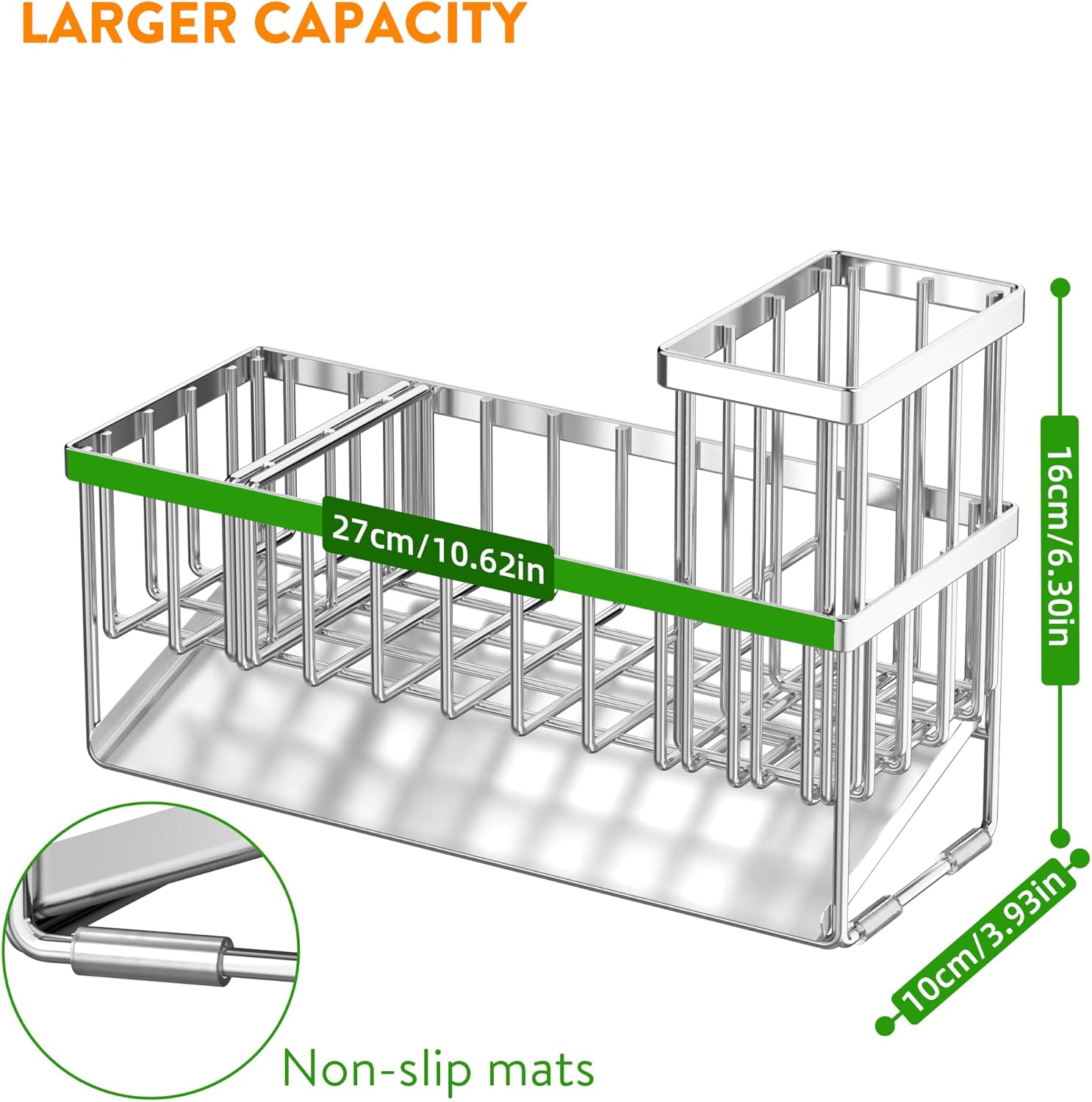 - ăPREMIUM STURDY MATERIALă Cisily kitchen sink organizer is made of premium stainless steel which can effectively prevent rust and deformation. And you can clean it easily by rinsing it under a running tap. Take the clutter out of your countertops.