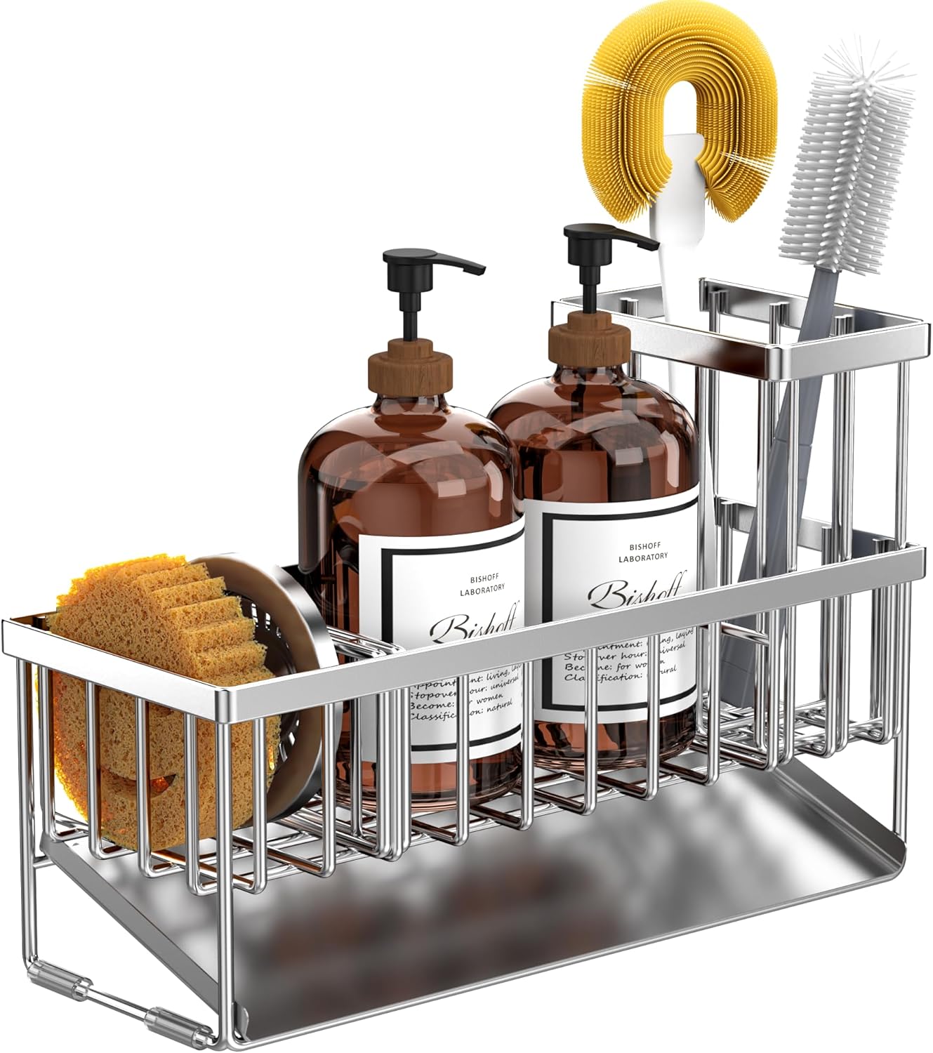 Cisily Extra Large Silver Kitchen Sink Caddy Organzier with High Brush Holder, Sponge Holder for Sink, 304 Rustproof Stainless, Kitchen Countertop Soap Dispenser Organizer For Decor and Accessories