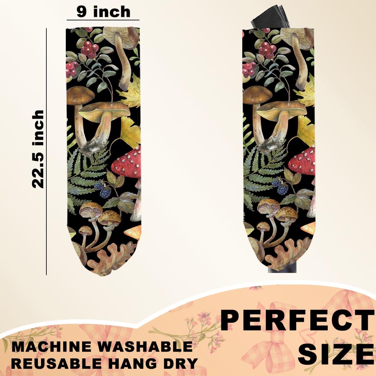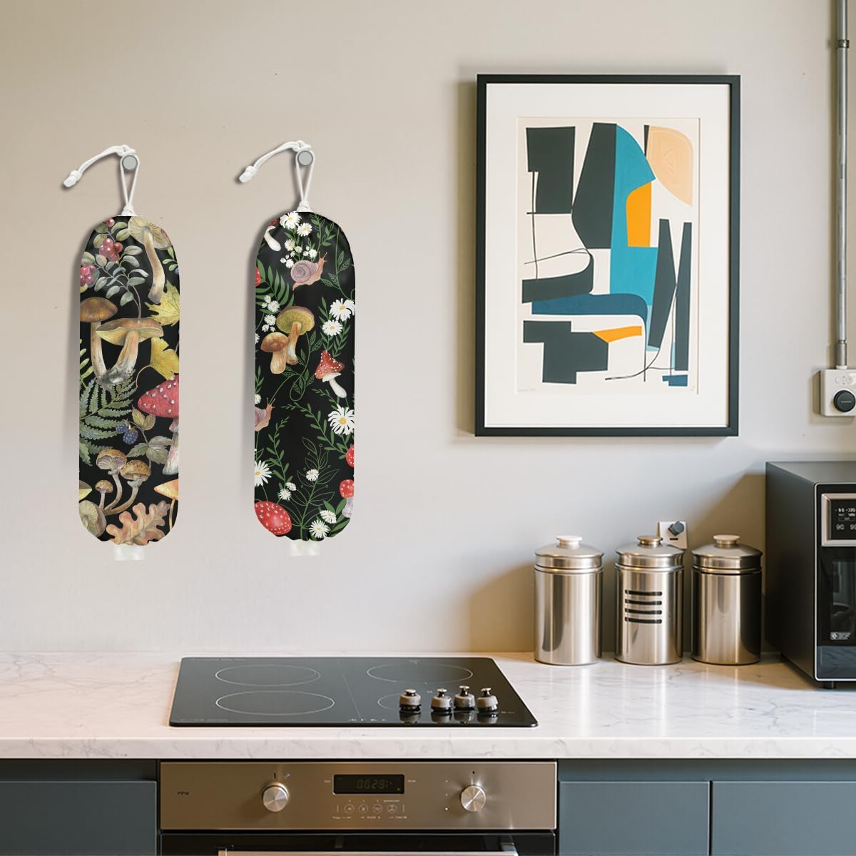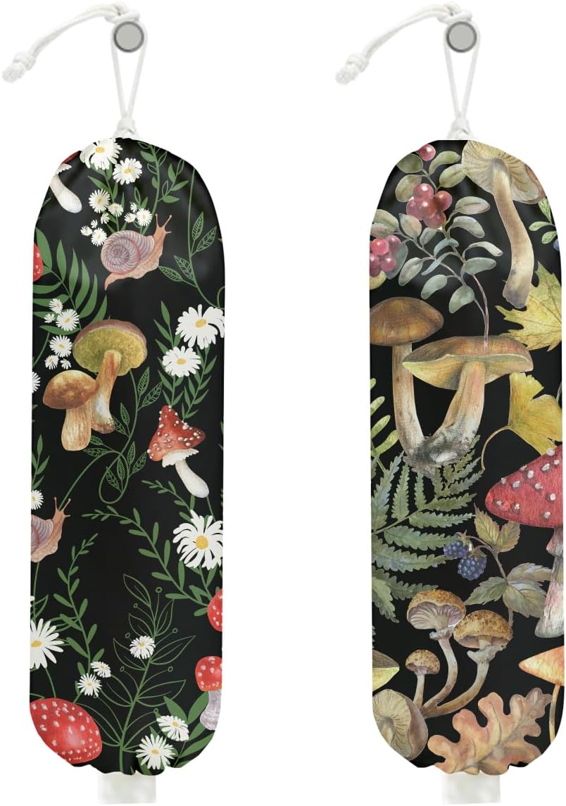 2Pcs Mushroom Plastic Bag Holder, Wall Mount Grocery Bag Holder for Plastic Bags, Summer Leaves Reusable Shopping Bags Storage Dispenser for Home Kitchen Pantry, Mushroom Gifts for Women
