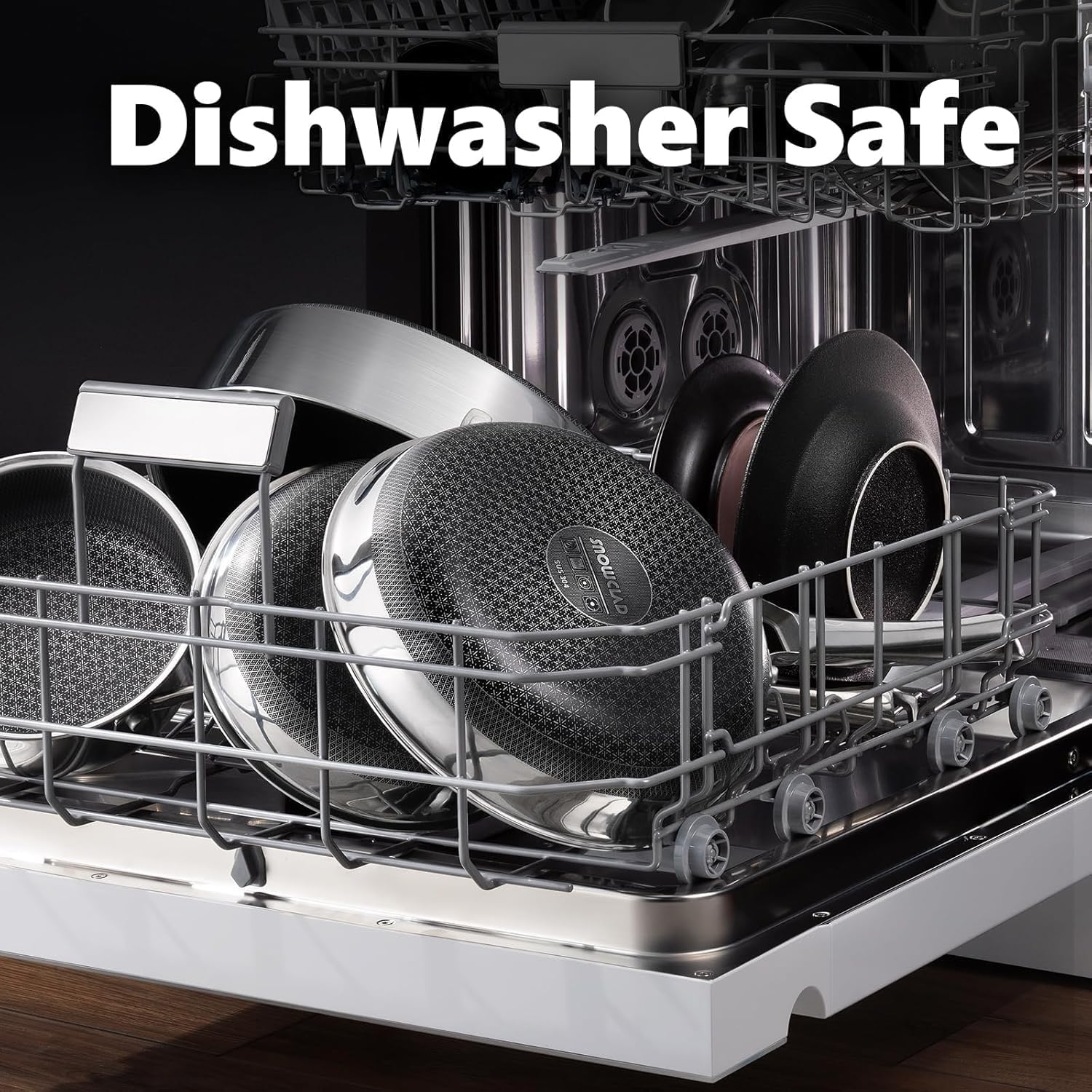 - 〔Premium Durability〕: Crafted with high-grade stainless steel, our pan is designed for enduring use. The non-toxic surface ensures a safe and efficient cooking experience. For added convenience, these pans are also dishwasher safe.