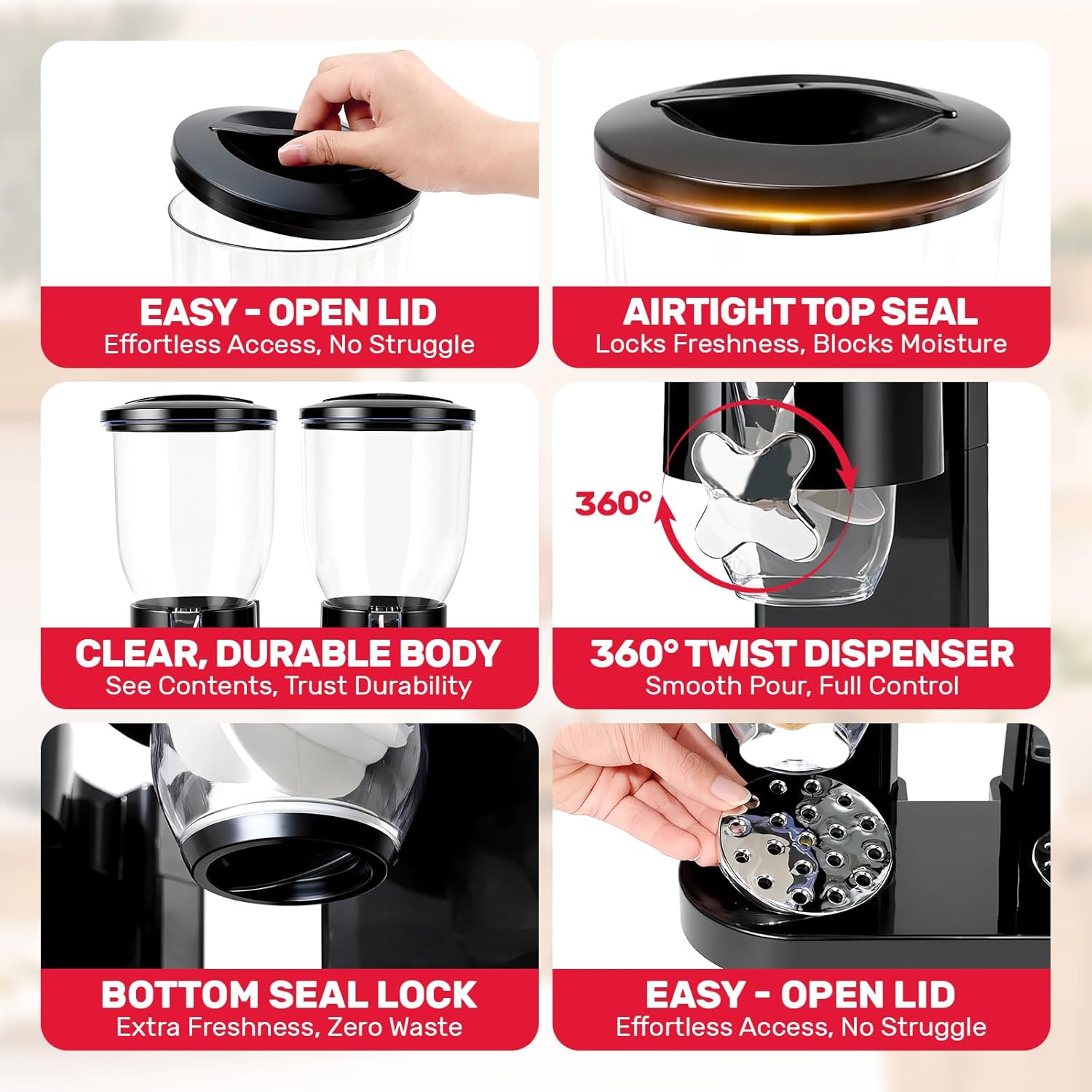 - Instant Serving & Precise Portion Control. Ergonomic twist design, One-handed operation easily dispense food with a light turn without tilting the container. Prevents spills and is friendly for both kids and seniors.