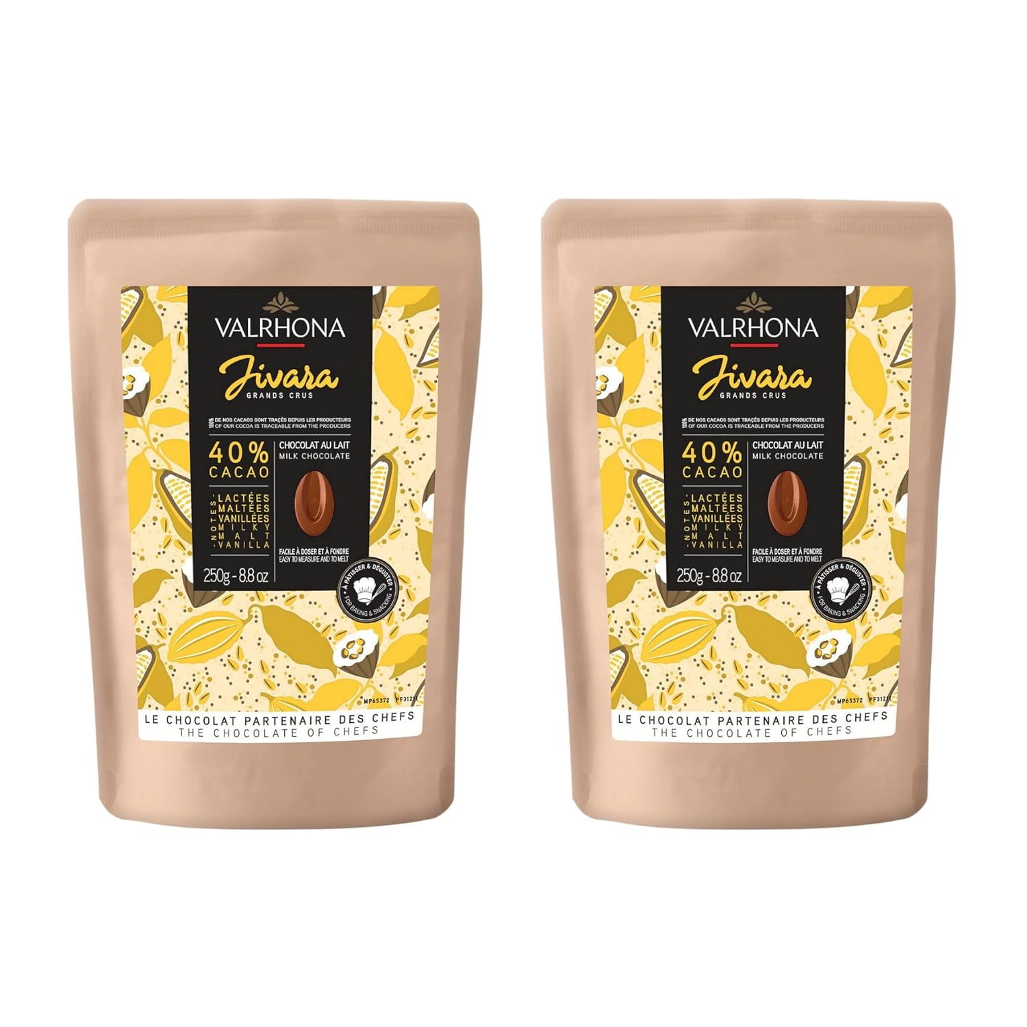 Valrhona Premium French Baking Creamy Milk Chocolate Discs (Feves). JIVARA 40% Cacao. Easy Melt and Tempering. Hints of Vanilla and Malt. For Cookies, Mousses, Frostings and Candies 250g (Pack of 2)