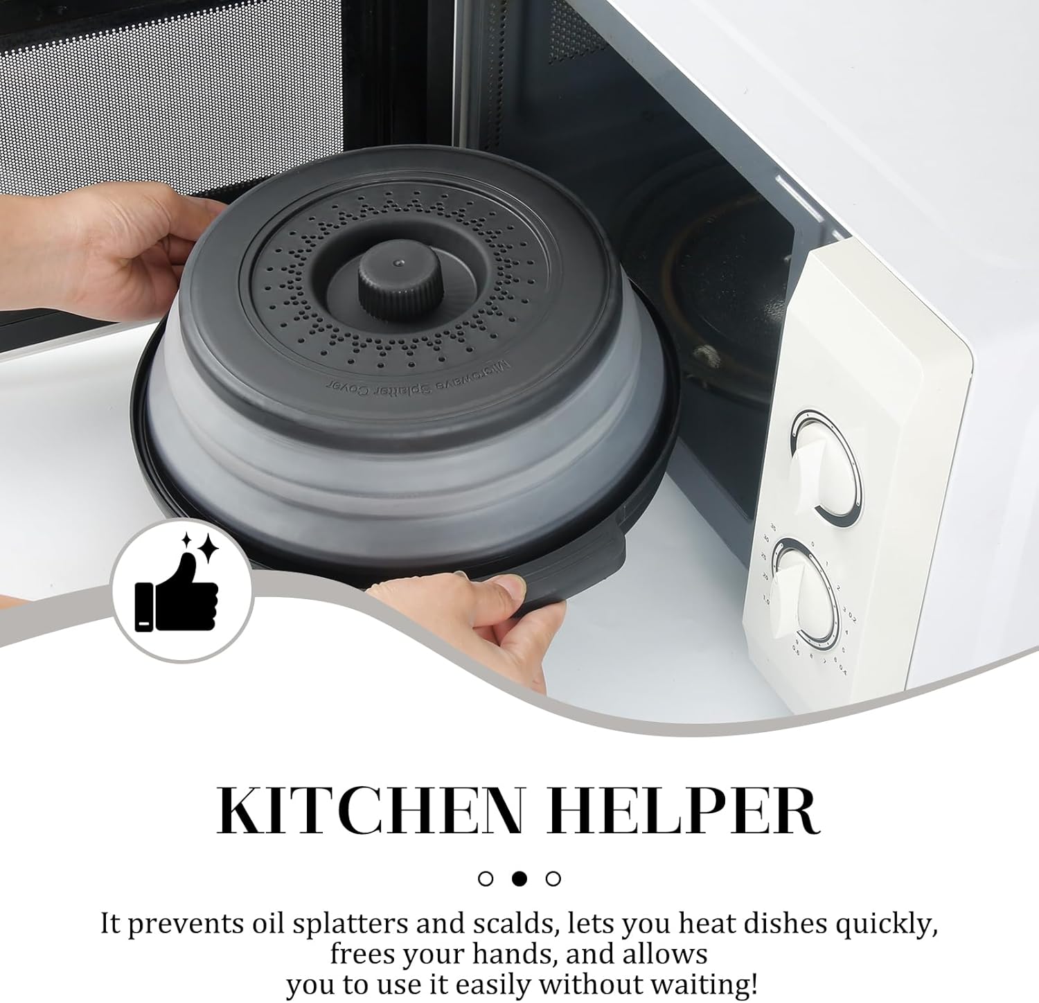 10.7 Inch Microwave Food Cover with Heat Insulation Mat, Anti-Scald Collapsible Microwave Splatter Cover, Multi-Functional as Colander & Fruit Plate, Dishwasher Safe, Ideal for Meal Prep (Black)