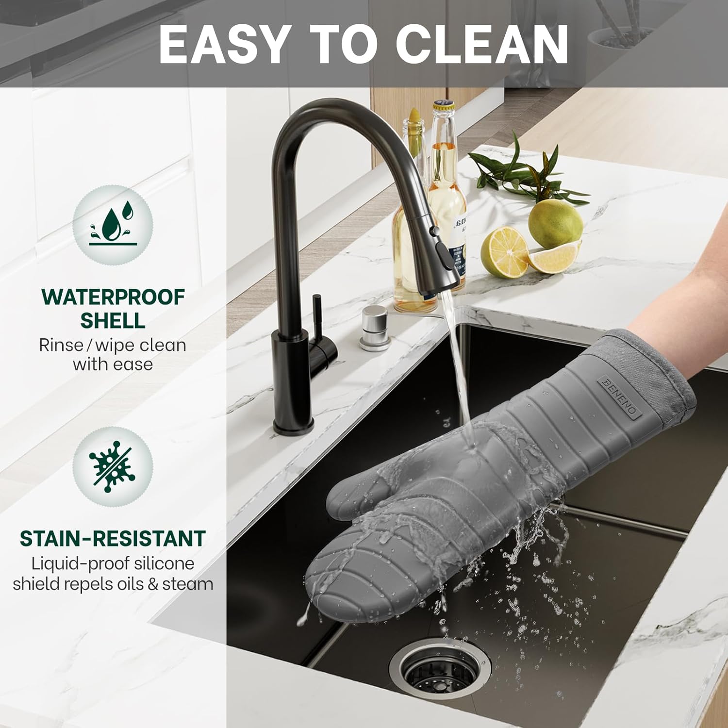Beneno BPA-Free Silicone Oven Mitts, Heat Resistant Waterproof Oven Mitts with Non-Slip Textured Grip, Comfortable Quilted Lining, Kitchen Pot Holders for Cooking, Baking, Grilling, 7"x13", 2Pcs Gray