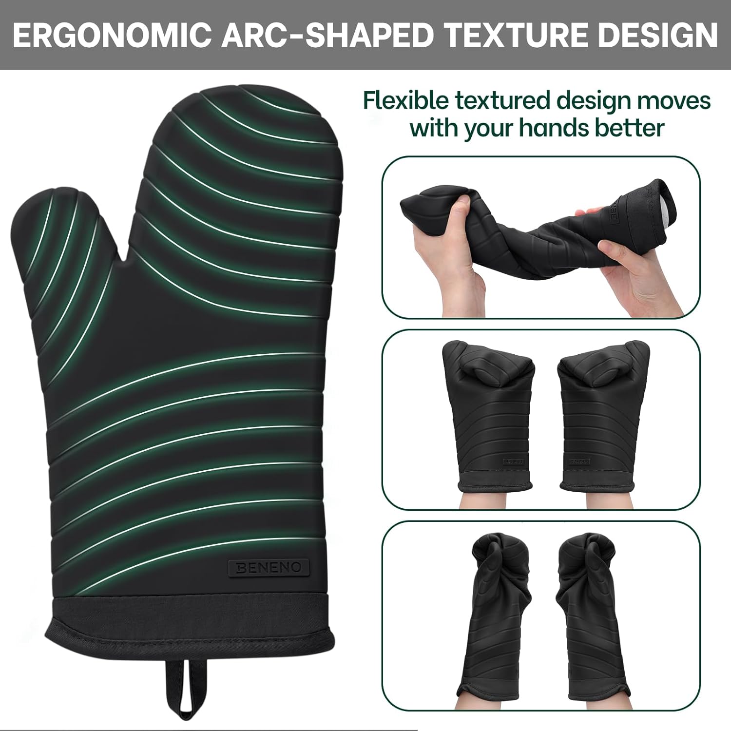 Beneno BPA-Free Silicone Oven Mitts, Heat Resistant Waterproof Oven Mitts with Non-Slip Textured Grip, Comfortable Quilted Lining, Kitchen Pot Holders for Cooking, Baking, Grilling, 7"x13", 2Pcs Black