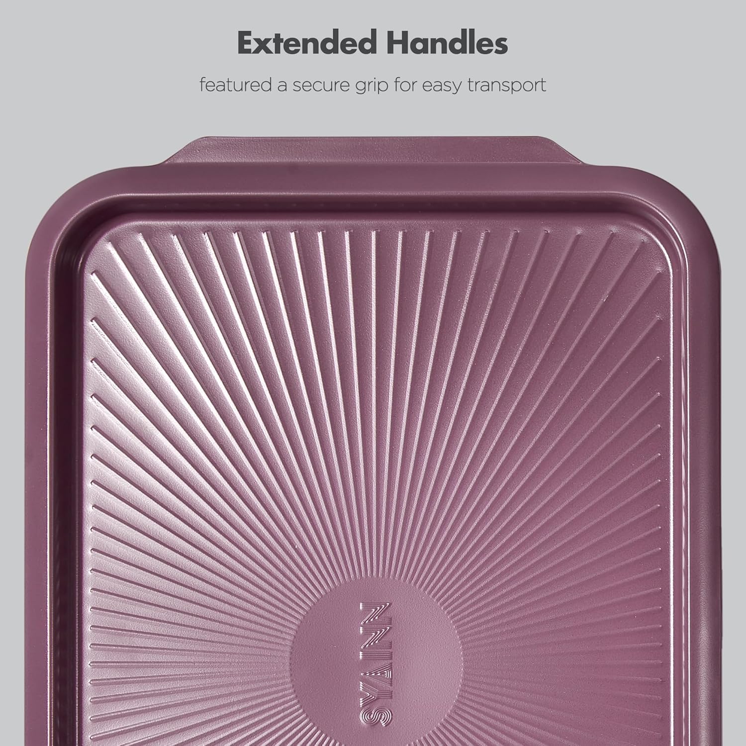 - Inspired by Retro-futurism - This oven pan features sleek, vintage curves and trendy matte colors, making it a stylish addition to your baking journey. The wide-edge folded handles ensure easy grip while saving storage space. The sun texture pattern on the base encourages airflow below the food. Rolled edges help keep it fairly warp-resistant when exposed to high heats and sudden temperature changes.