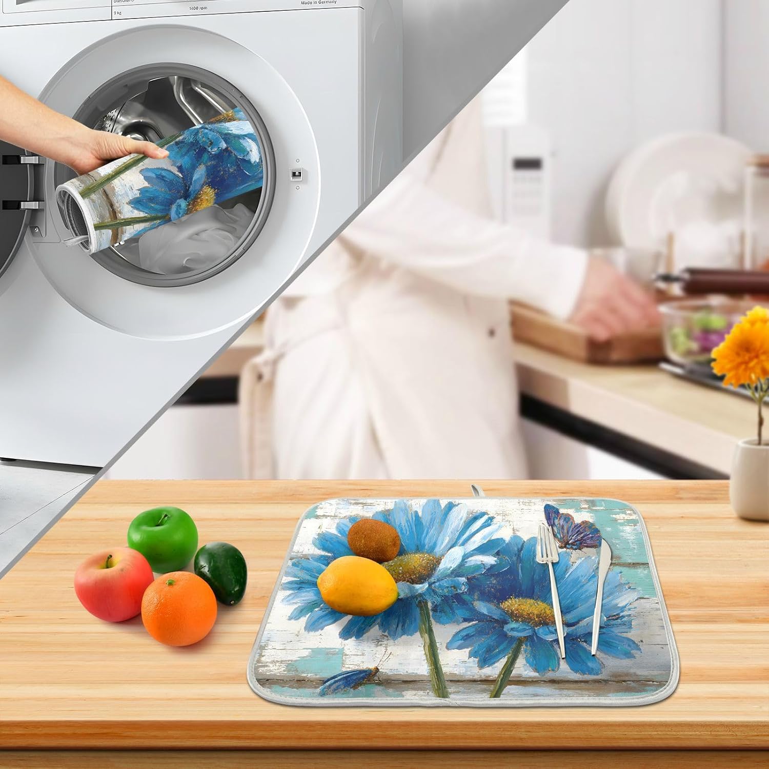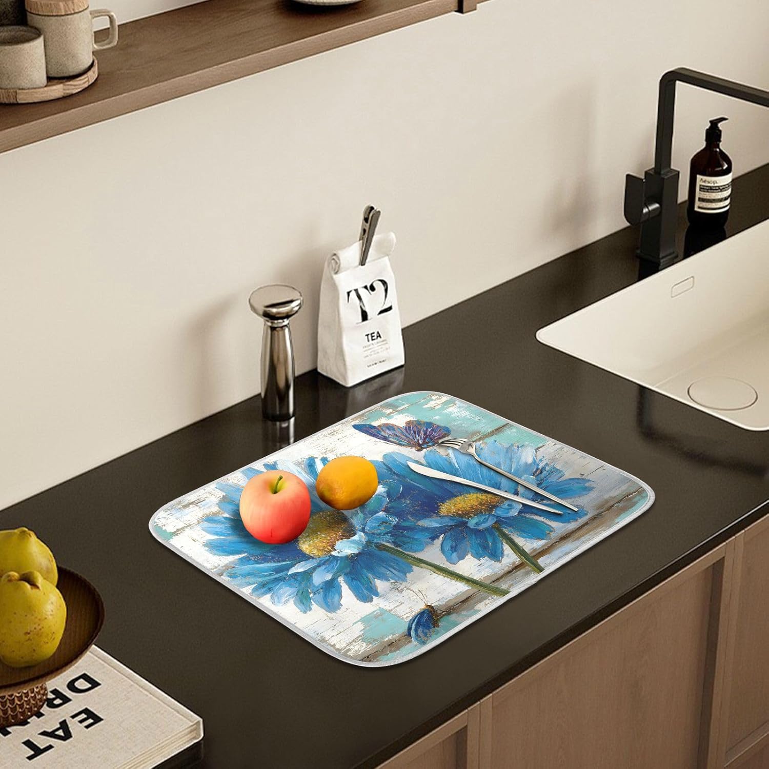 Rustic Daisy Blue on Vintage Wooden Dish Drying Mat for Kitchen Counter Absorbent Microfiber Small Drying Pad Dish mats for Kitchen Countertops 16 x 18 Inch
