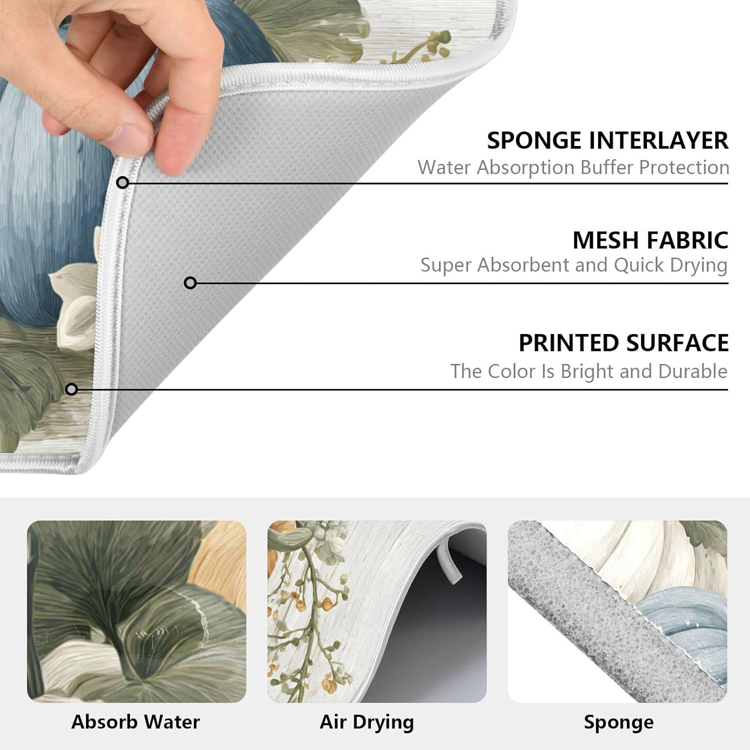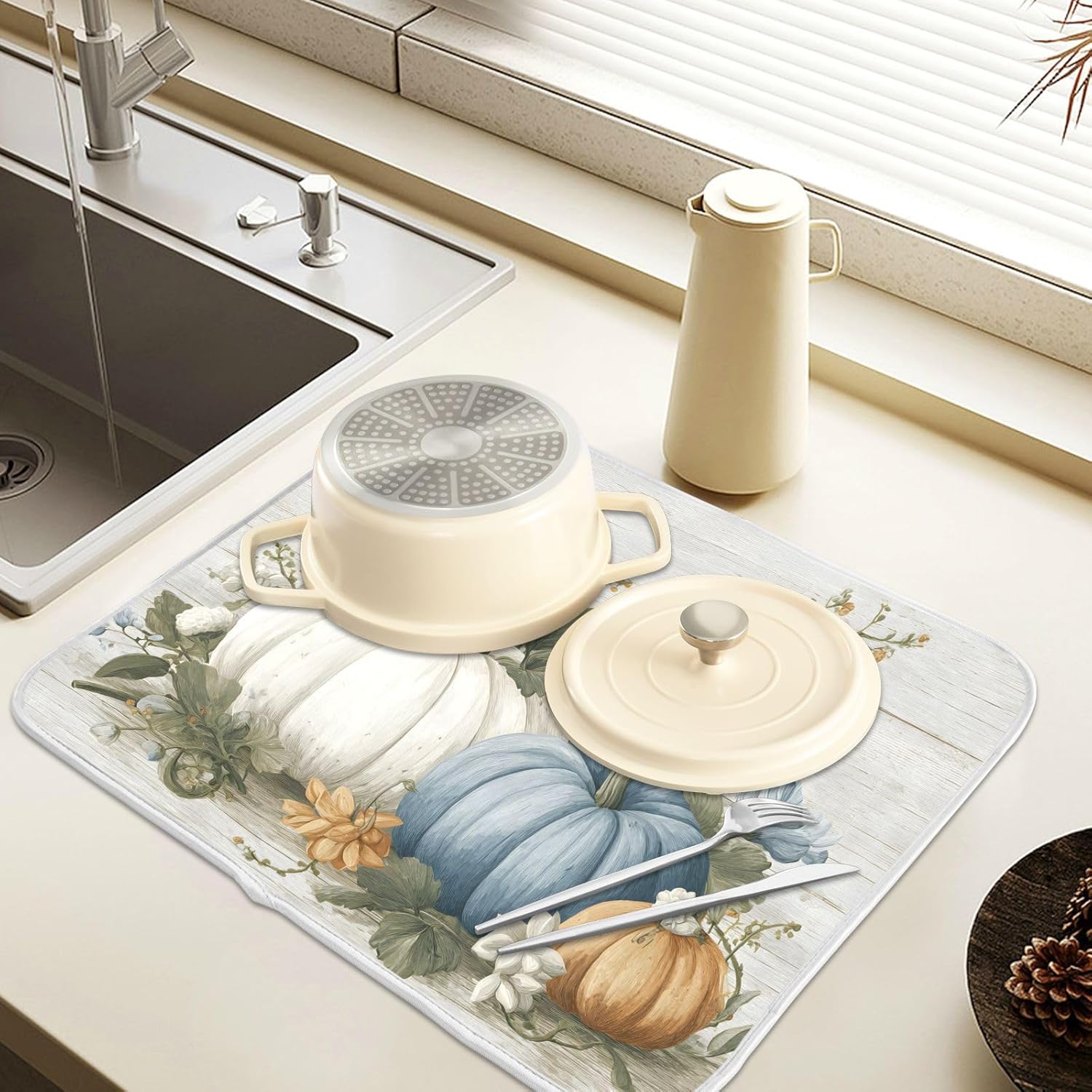 Fall Blue Orange Grey Pumpkin Thanksgiving Dish Drying Mat for Kitchen Counter Absorbent Microfiber Small Drying Pad Dish mats for Kitchen Countertops 16 x 18 Inch