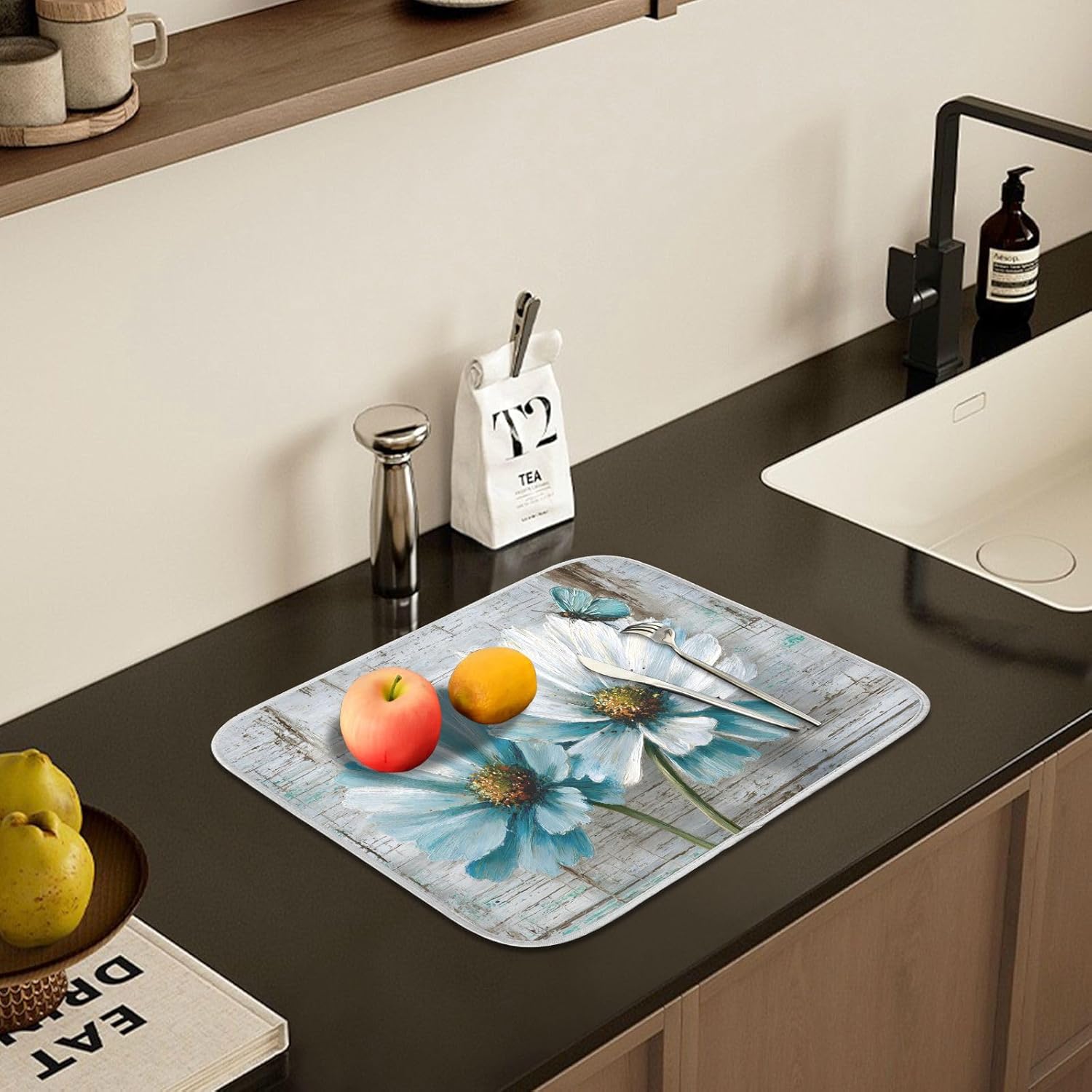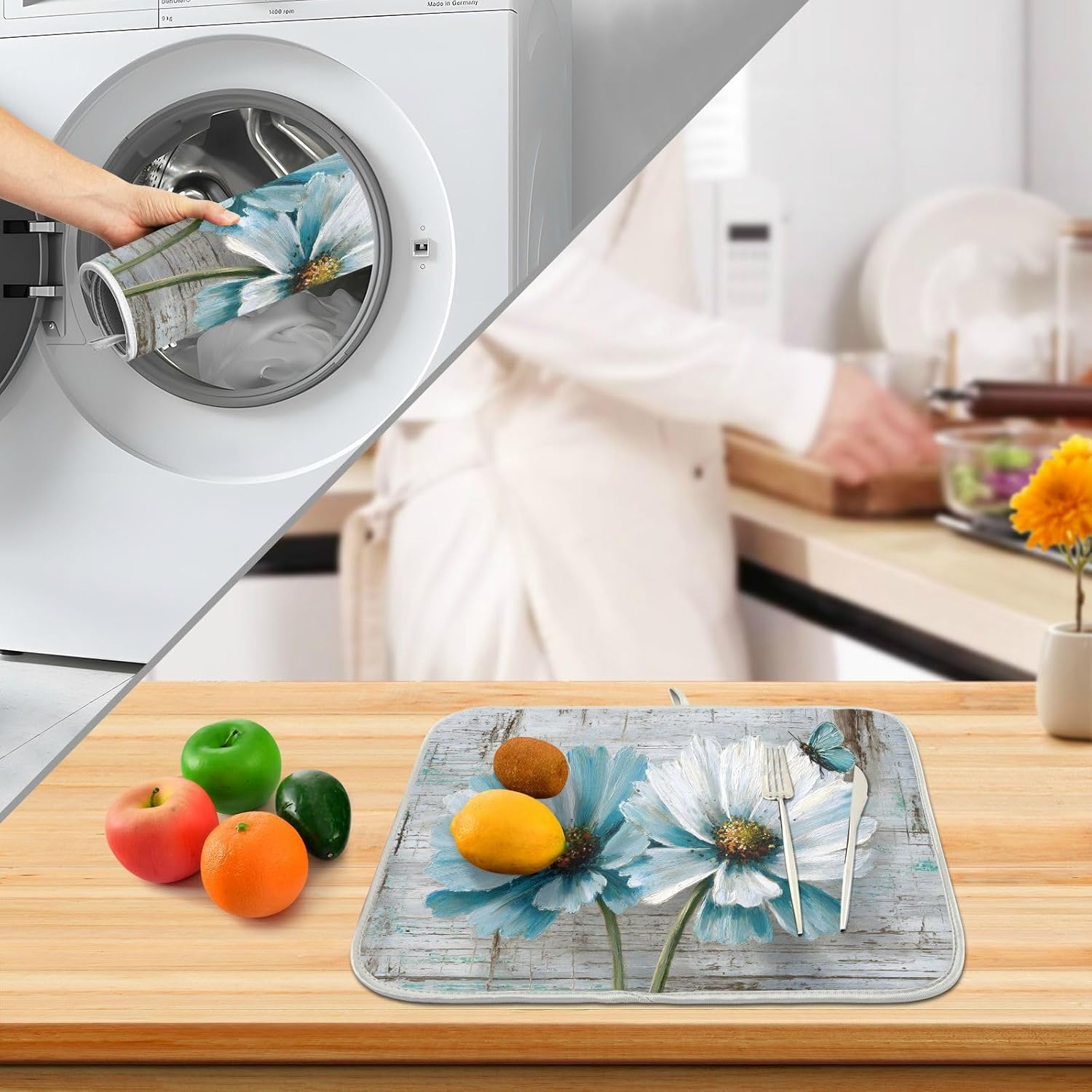 Rustic Teal White Daisy on Vintage Wooden Dish Drying Mat for Kitchen Counter Absorbent Microfiber Small Drying Pad Dish mats for Kitchen Countertops 16 x 18 Inch