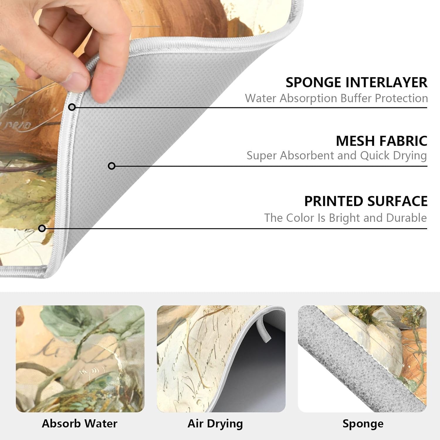 - Exquisite workmanship: This dish drying mat with durable and neatly sewing around the edge helps contain spills, the stitches don't fall off so that they are reversible for convenience and optimal performance, but one-sided printing, matchs delicate dishes and stemware, bring decorations to your home or kitchen, keeping tables clean, the soft and foldable material is easy to store, this dry pad has a lanyard design, which can be hung up when you are not in use and does not take up space